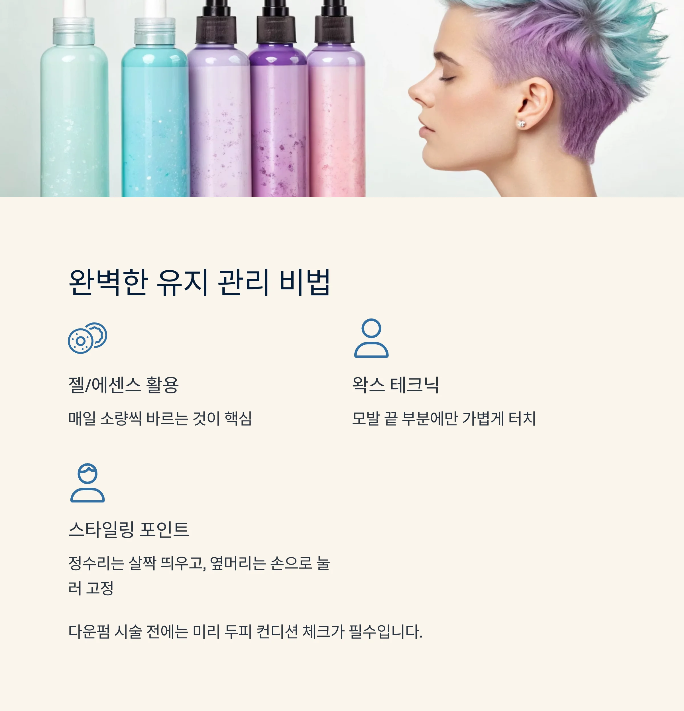 | 홈케어 방법 | 다운펌 스틱, 눌러주는 왁스 활용 |