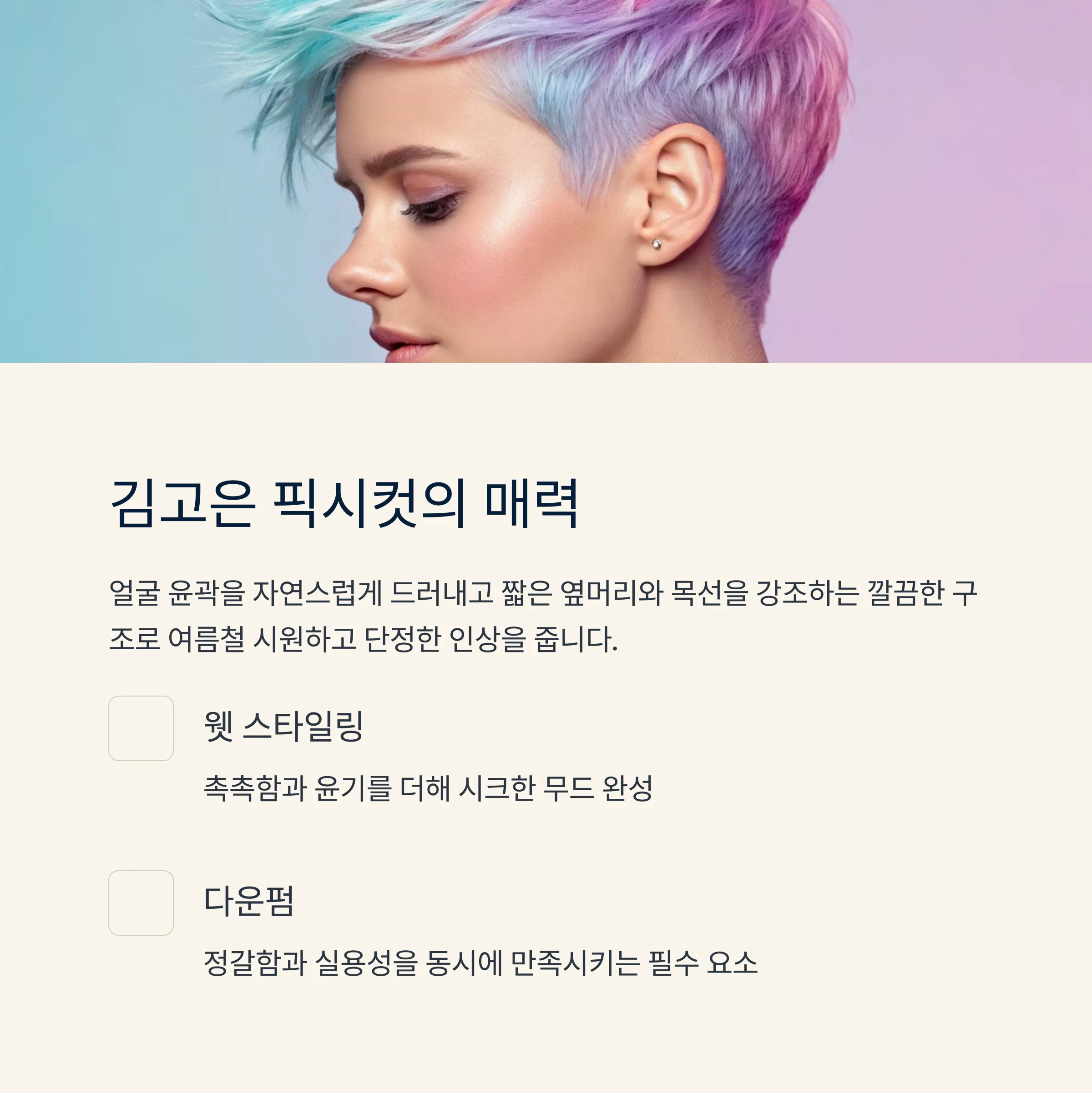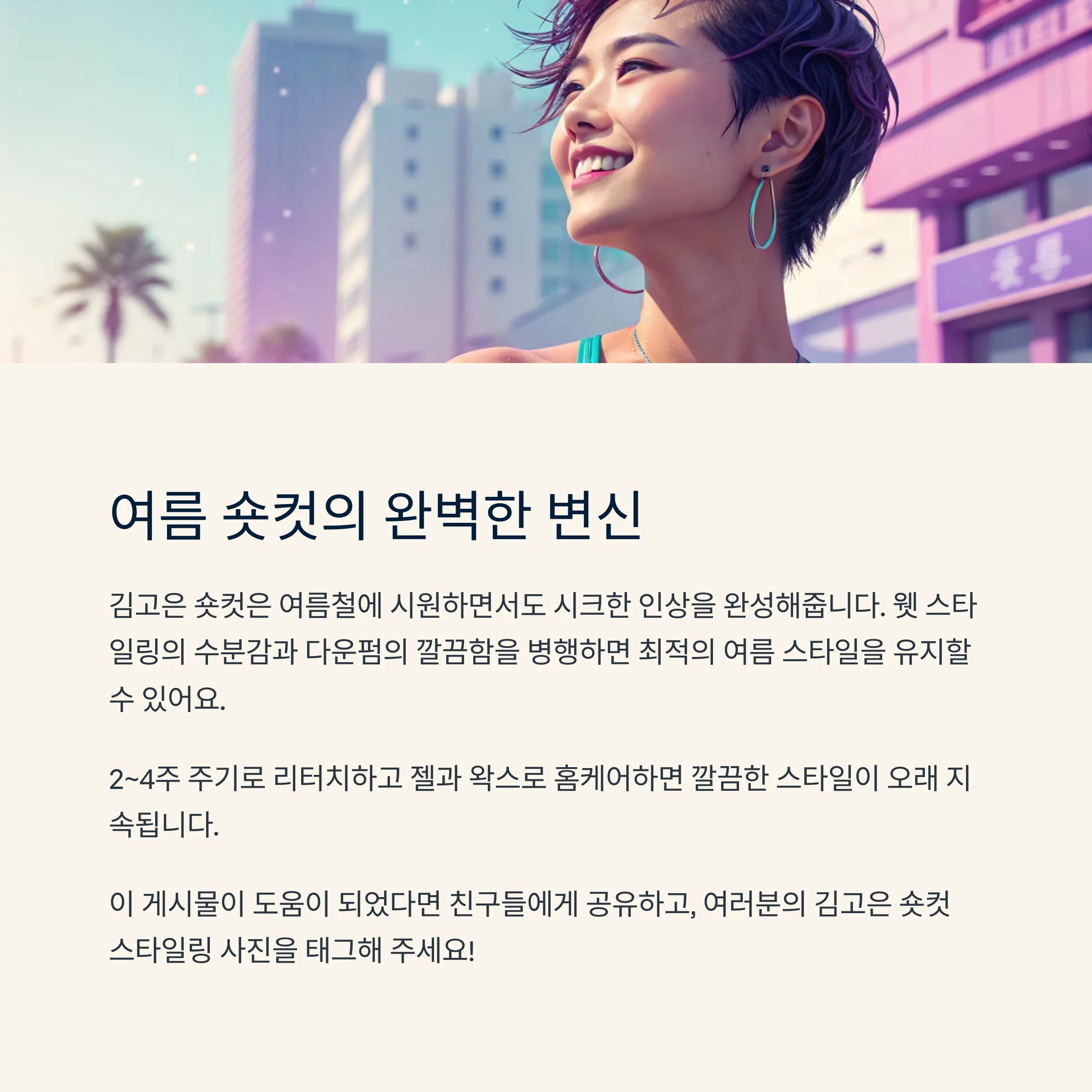 - 두 가지 스타일을 병행하면 여름철 최적의 숏컷 유지 가능