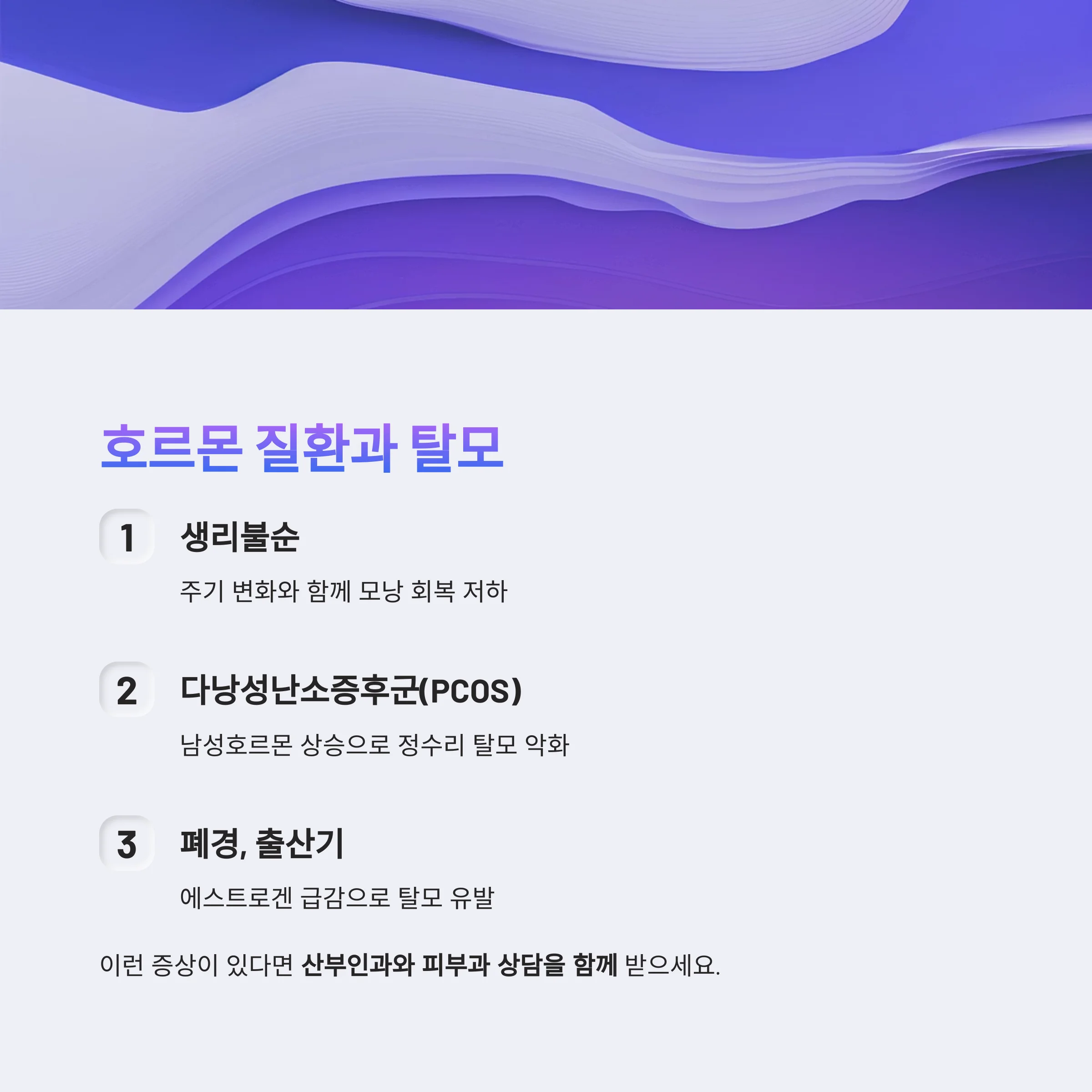 | 폐경, 출산기 | 에스트로겐 급감으로 탈모 유발 |