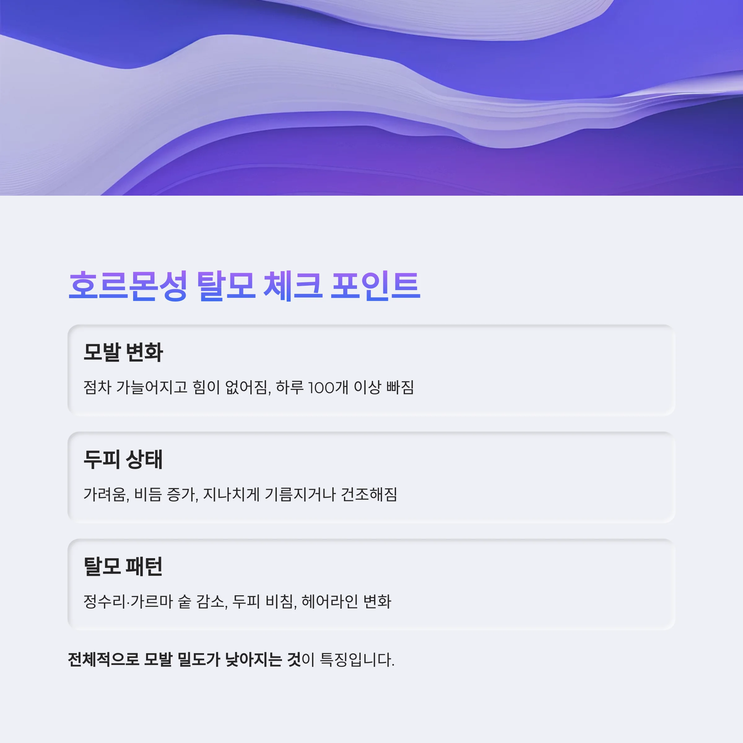 | 모발 굵기 변화 | 점차 가늘어지고 힘이 없어짐 |