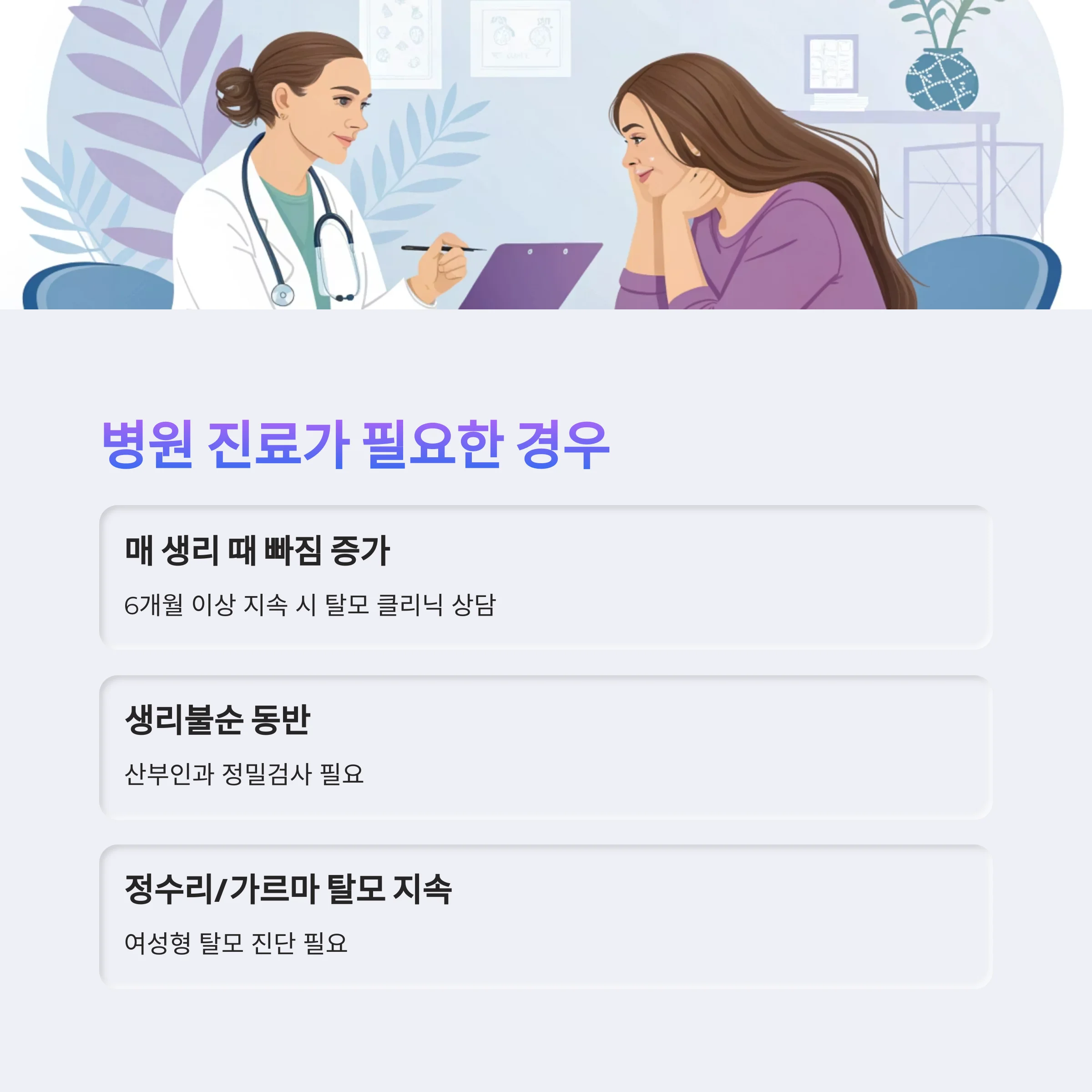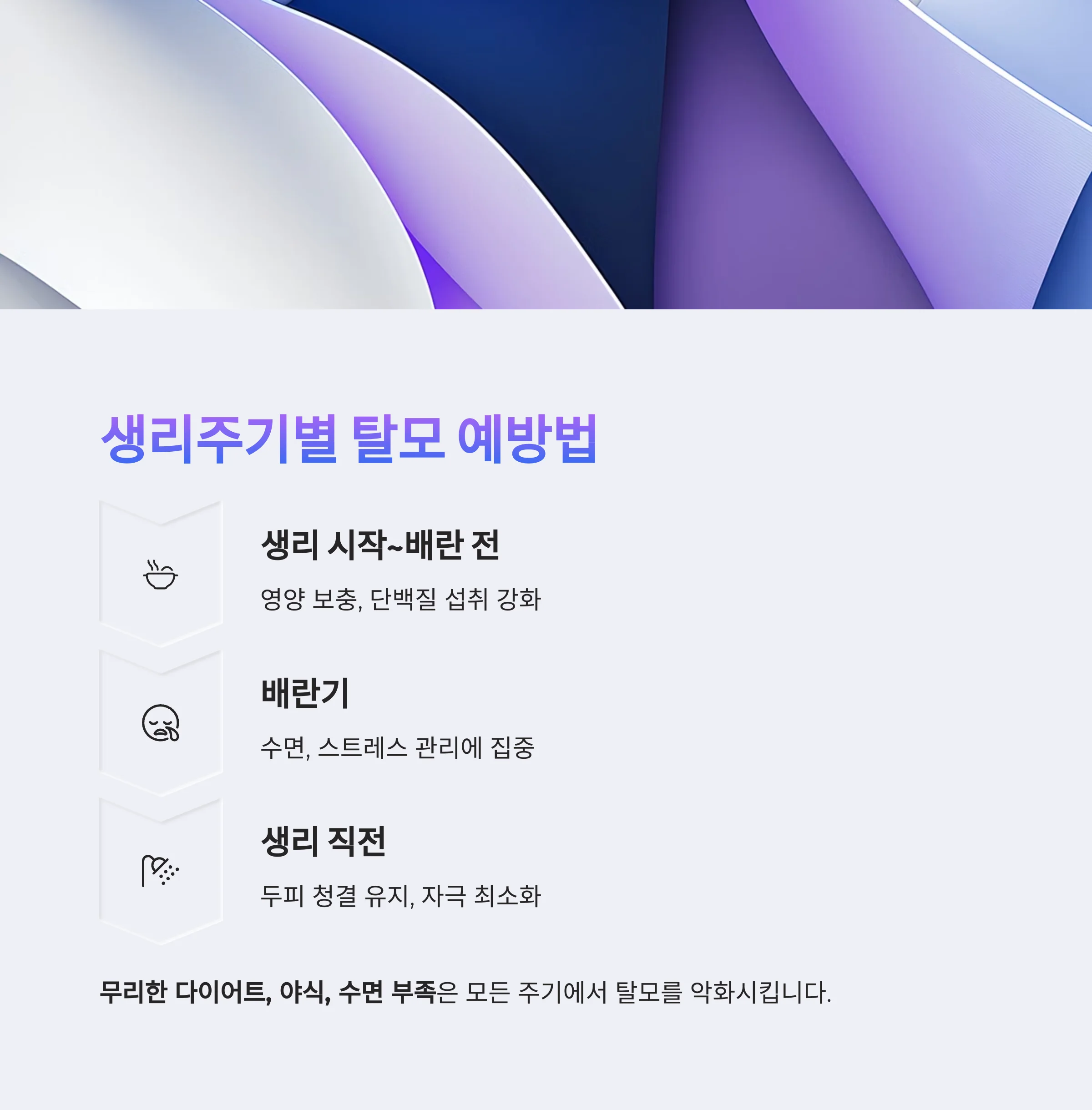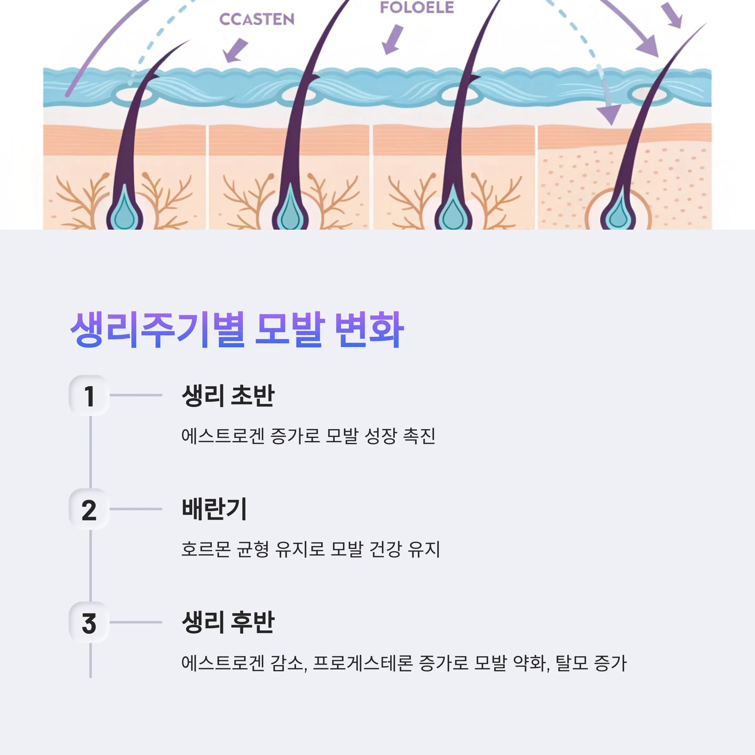 | 생리 후반 | 에스트로겐 감소, 프로게스테론 증가 | 모발 약화, 탈모 증가 |
