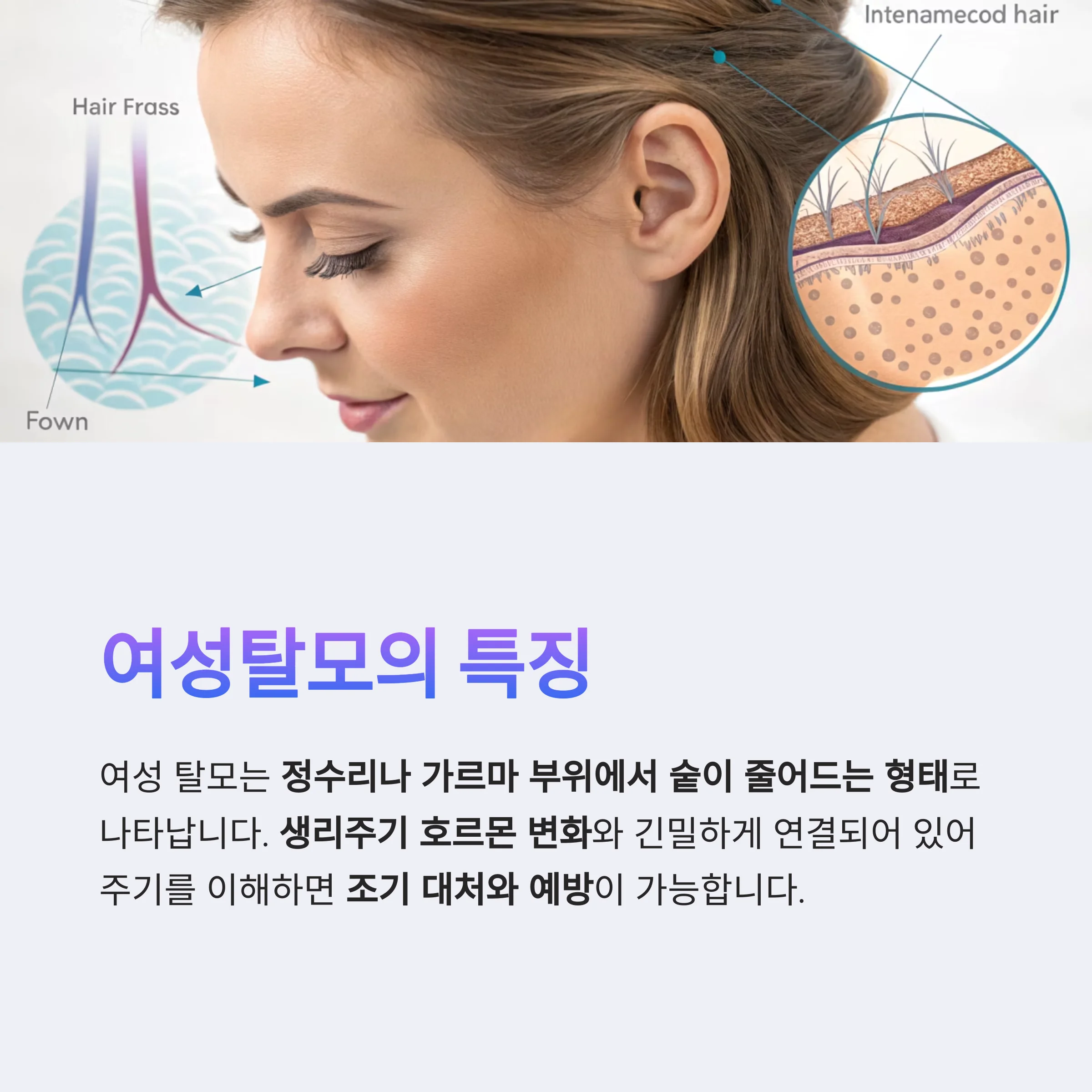 이러한 탈모는 에스트로겐, 프로게스테론 같은 생리주기 호르몬 변화와 긴밀하게 연결되어 있어