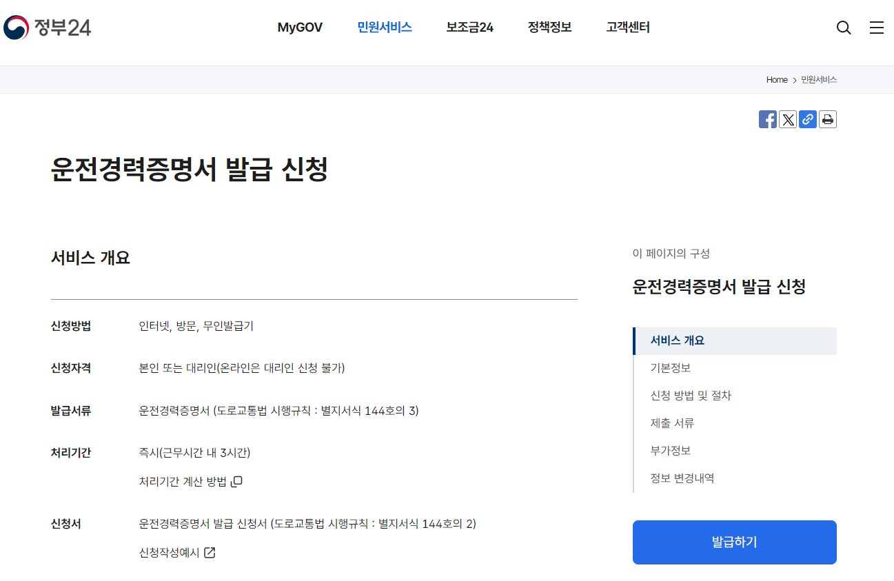 도로교통공단 외에도 정부24를 통해서도 ‘운전경력증명서’를 발급받을 수 있어요. 이 서류에도 최초 취득일이 명시되어 있어 공공기관이나 해외기관에 제출할 때 활용도가 높습니다.