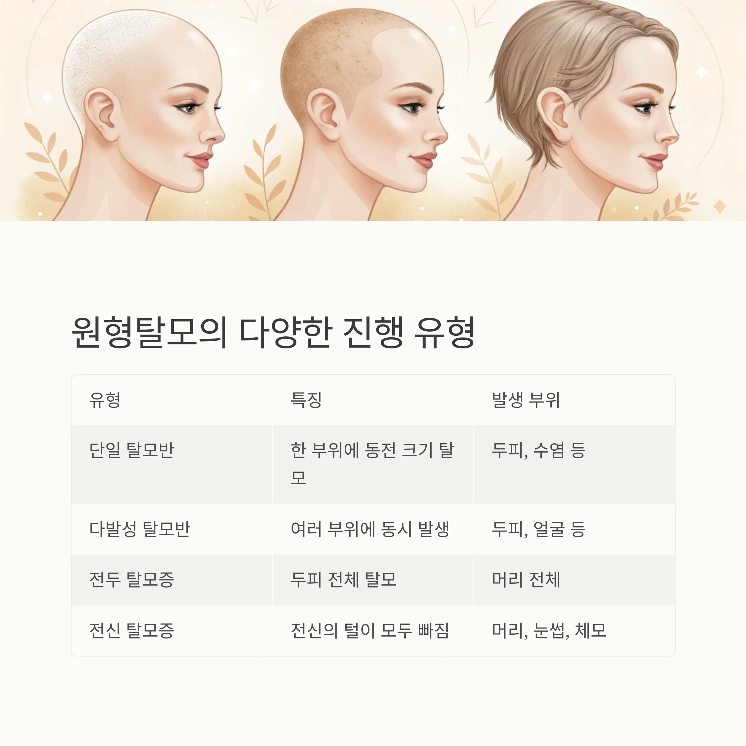 | 다발성 탈모반 | 여러 부위에 동시에 탈모반 발생 | 두피, 얼굴 등 |