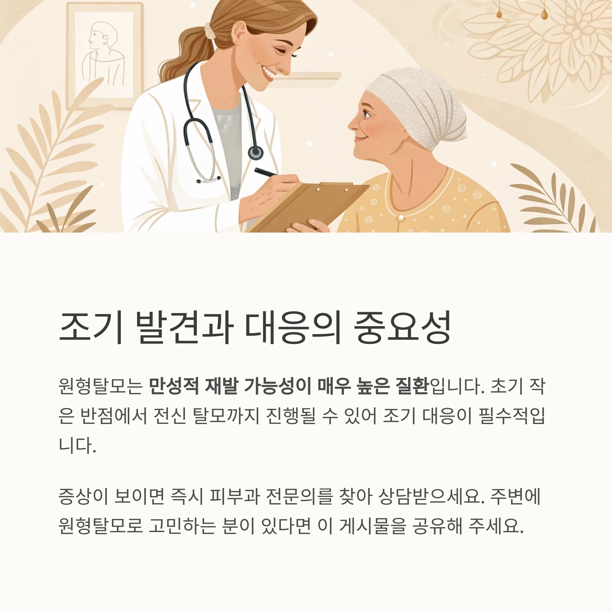 방치 시 전신 탈모까지 진행될 수 있어 조기 대응이 매우 중요합니다