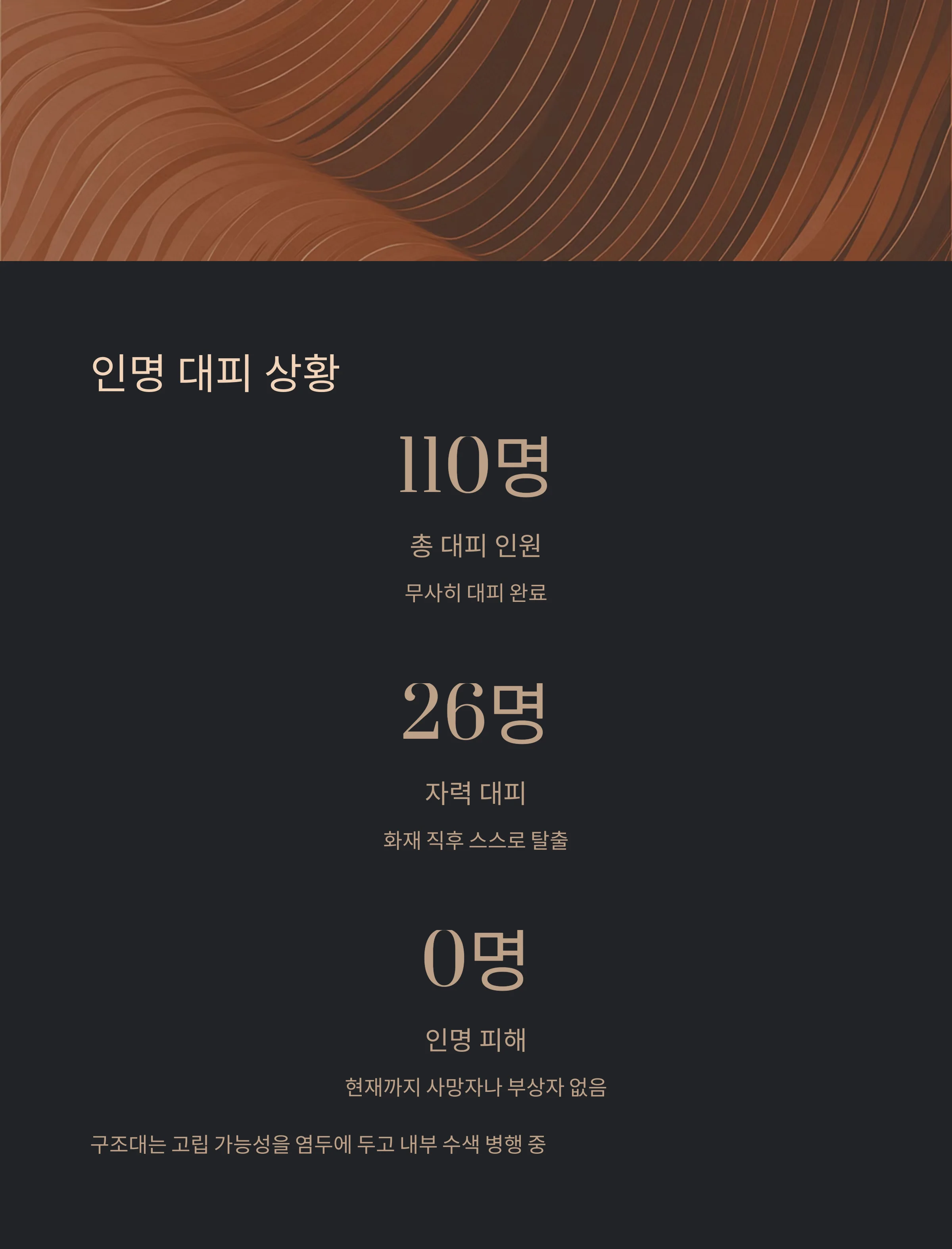 총 110명이 무사히 대피한 가운데, 인명 피해는 아직까지 보고되지 않았지만, 내부 고립 가능성이 있어 상황을 주시해야 합니다.