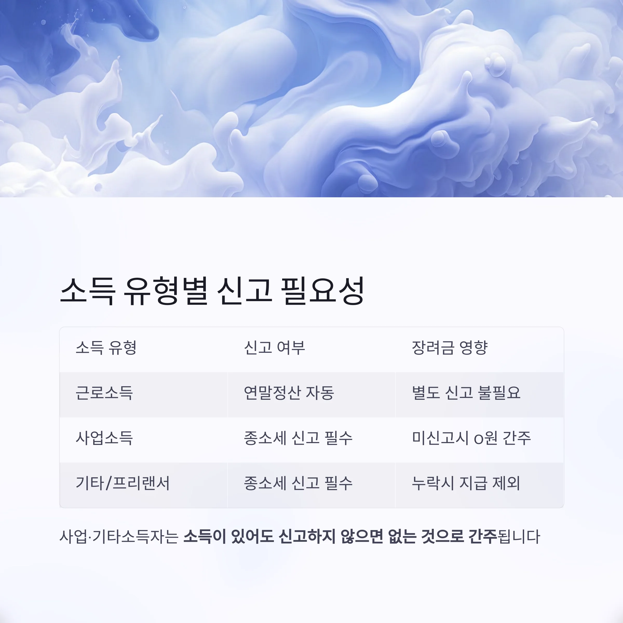 "사업·기타소득자는 소득이 있더라도 신고하지 않으면 없는 것으로 간주됩니다."