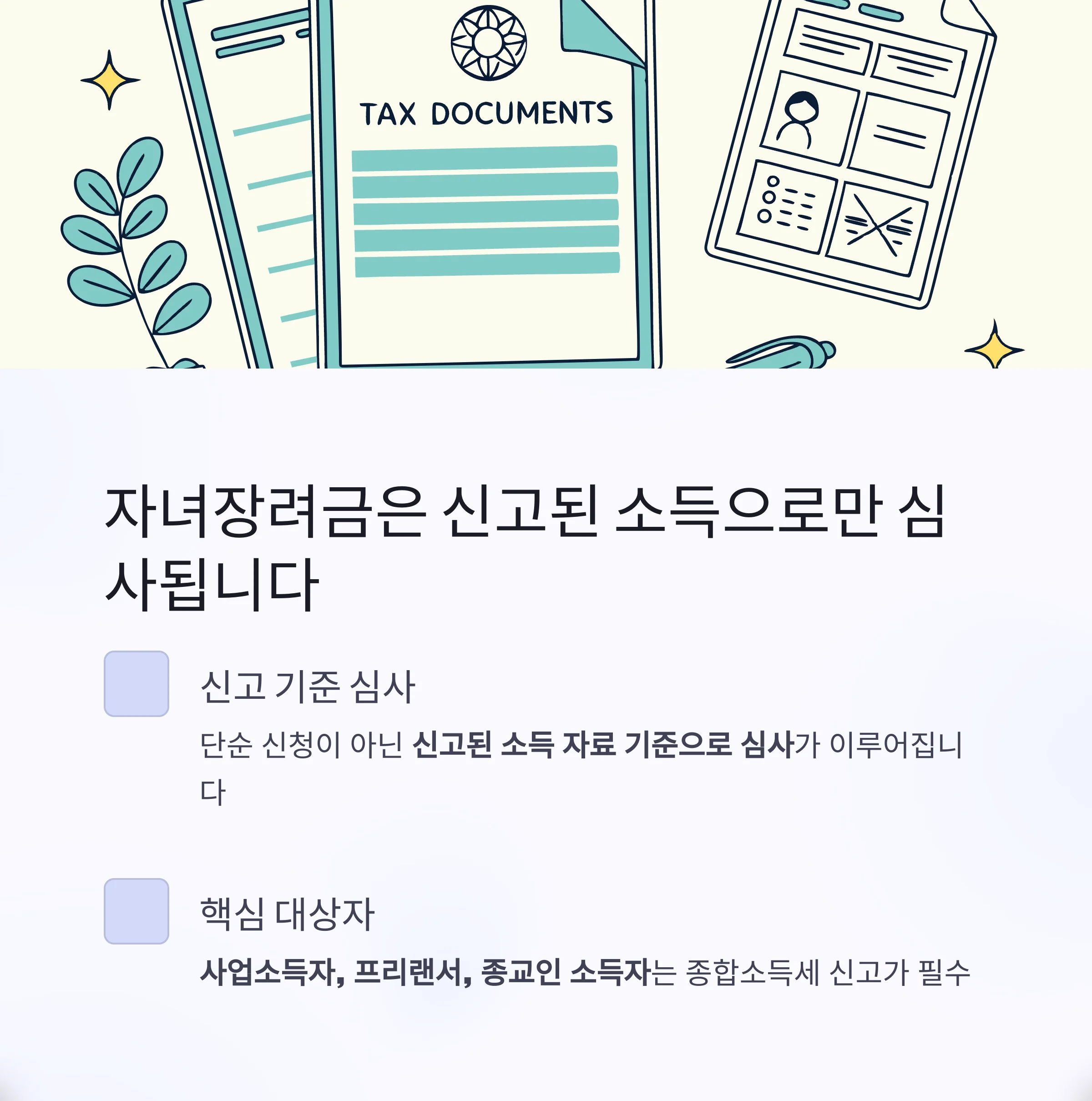 자녀장려금은 단순한 신청만으로 받는 것이 아니라, 신고된 소득 자료를 기준으로 심사가 이뤄지는 제도입니다.