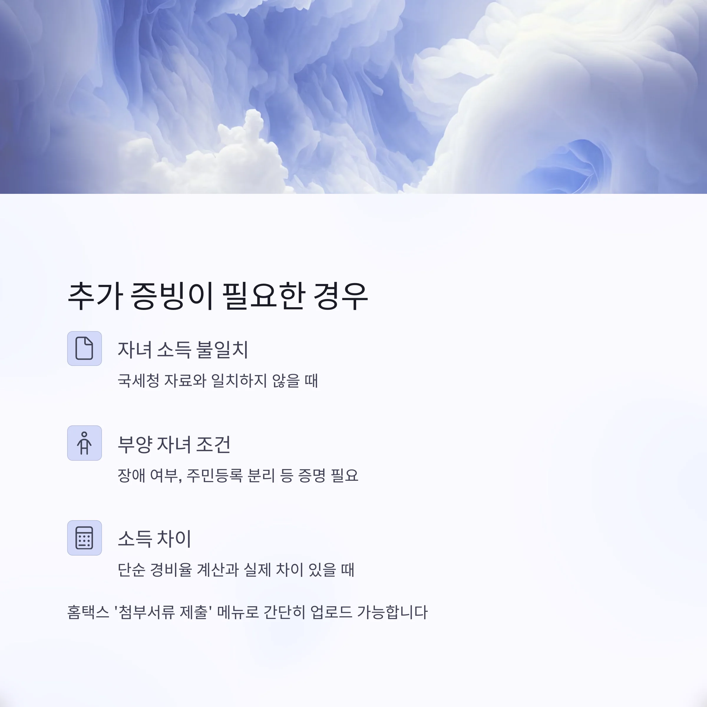 • 부양 자녀 조건(장애 여부, 주민등록 분리 등) 증명이 필요할 때