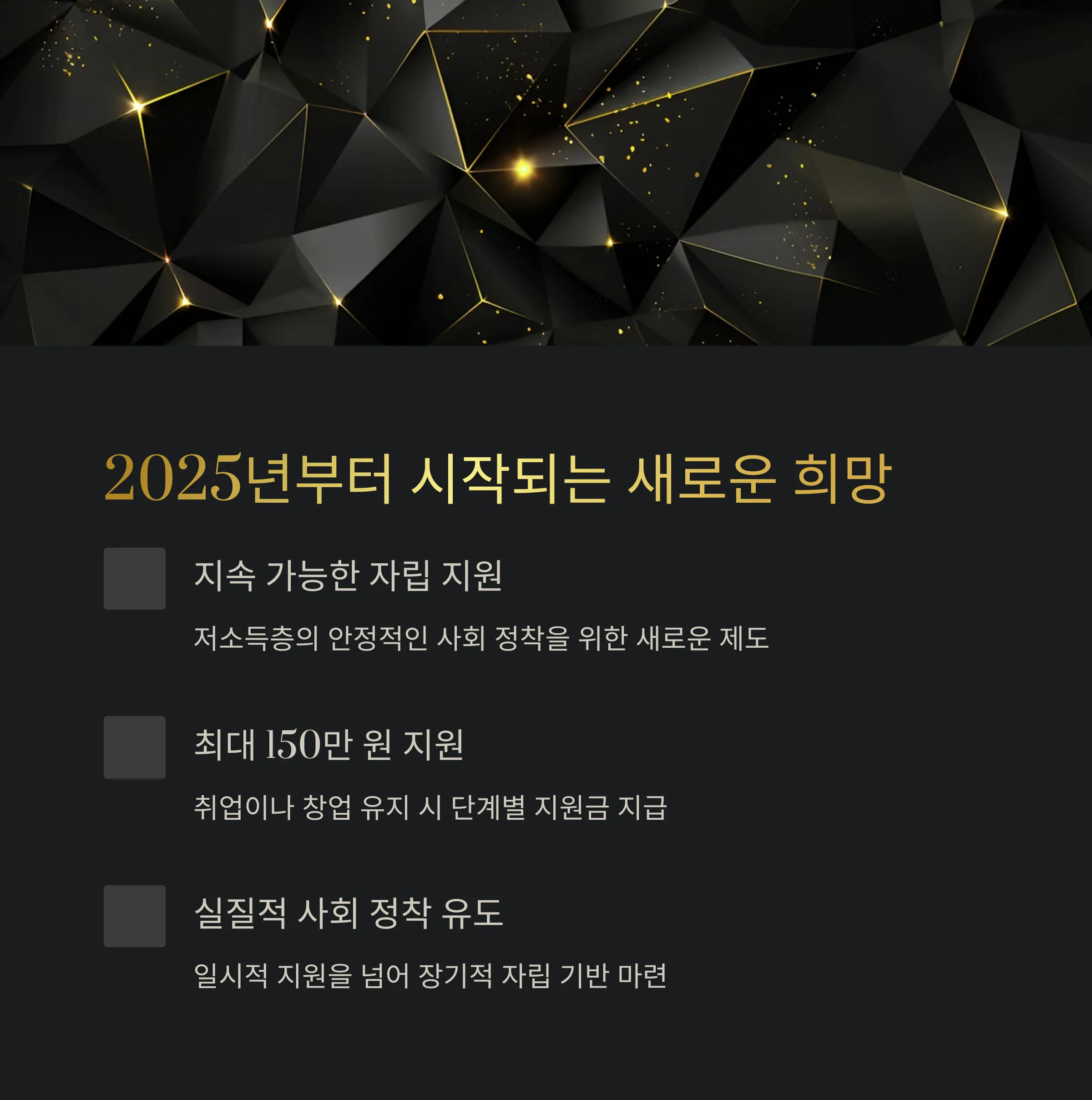 2025년부터 저소득층의 지속 가능한 자립을 돕기 위한 자활 성공 지원금 제도가 새롭게 도입됩니다.