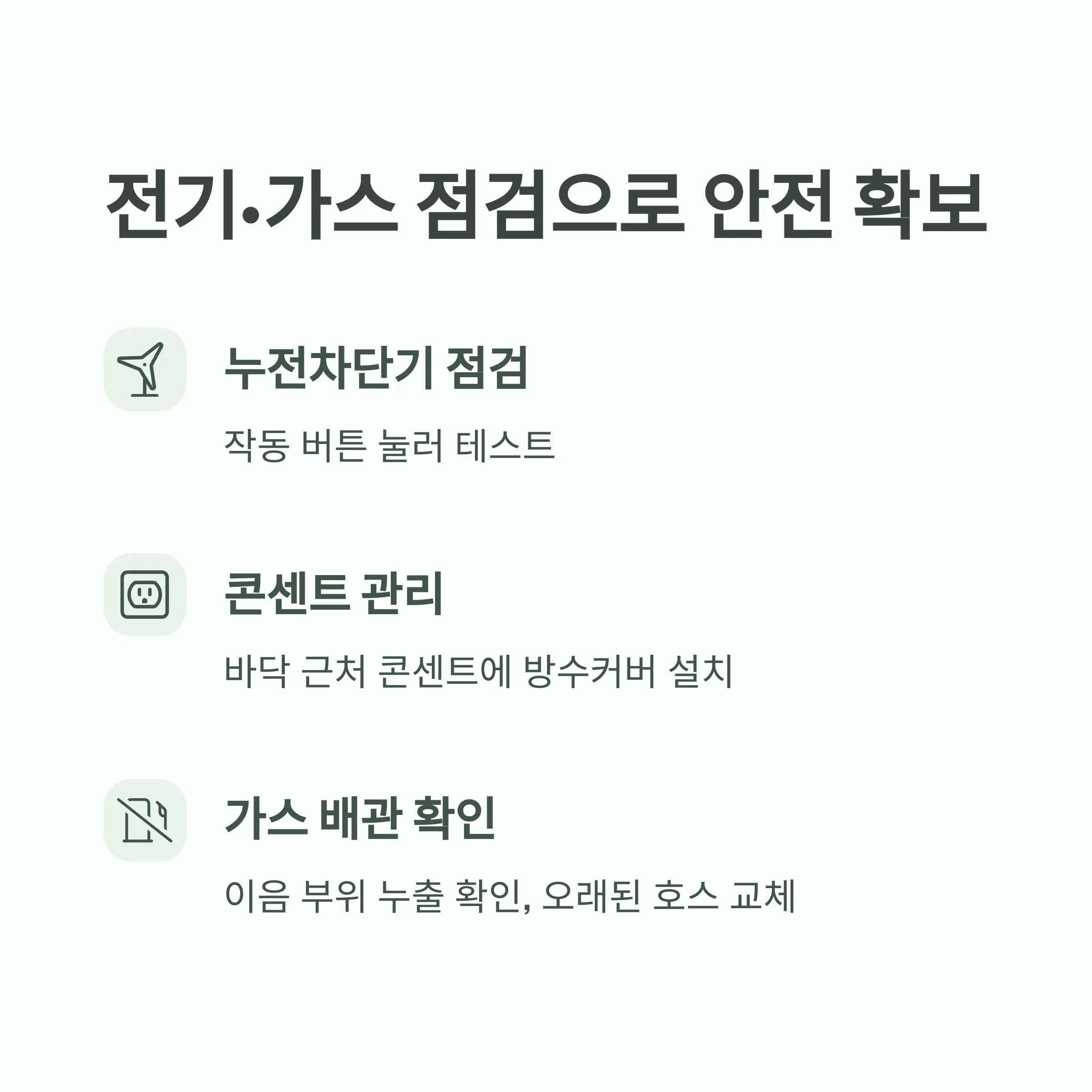 | 전기·가스 안전 | 누전차단기 확인, 콘센트 방수, 가스밸브 점검 |