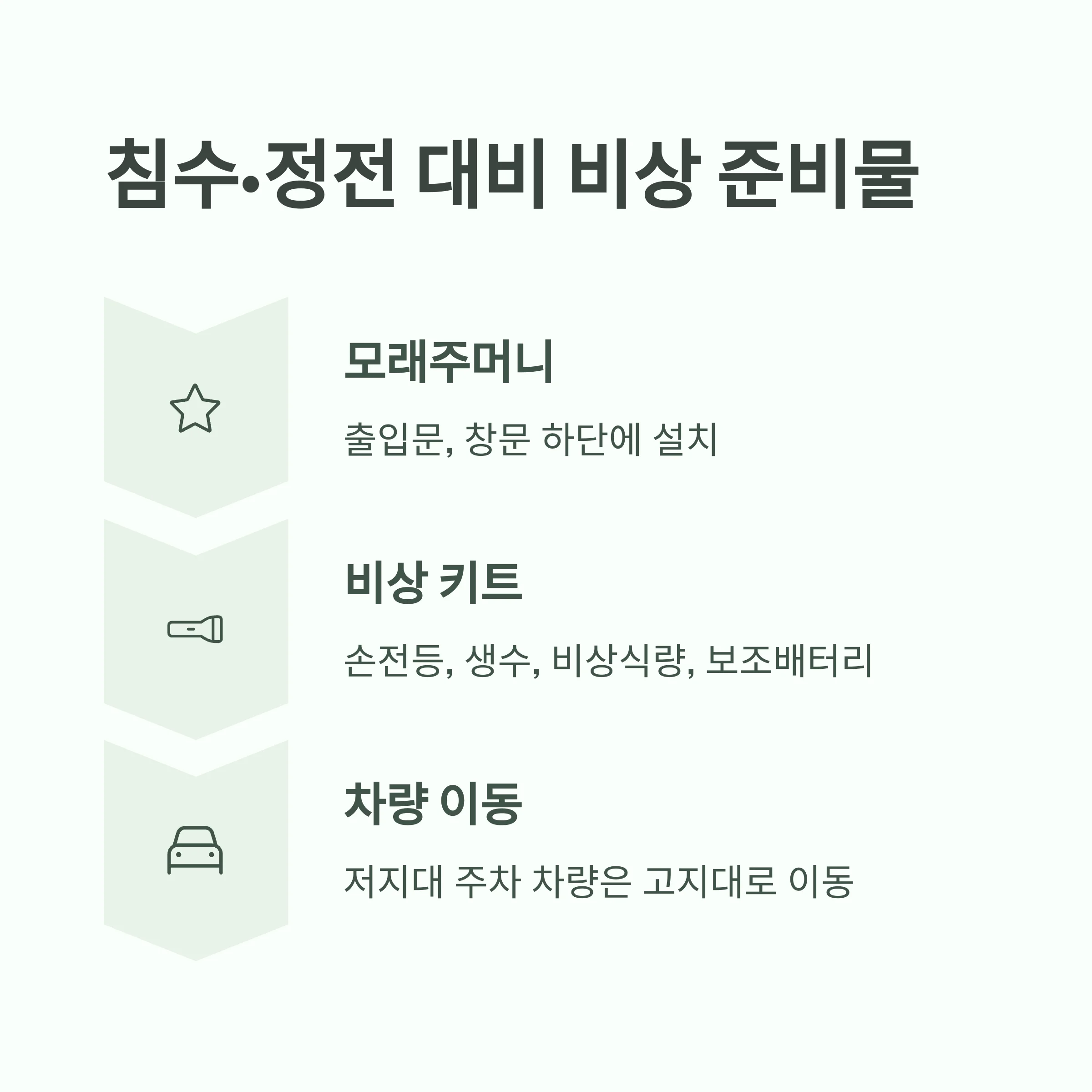 침수 대비는 단지 ‘물막기’가 아니라, 정전·단수·격리 상황까지 고려한 대비가 필요합니다.