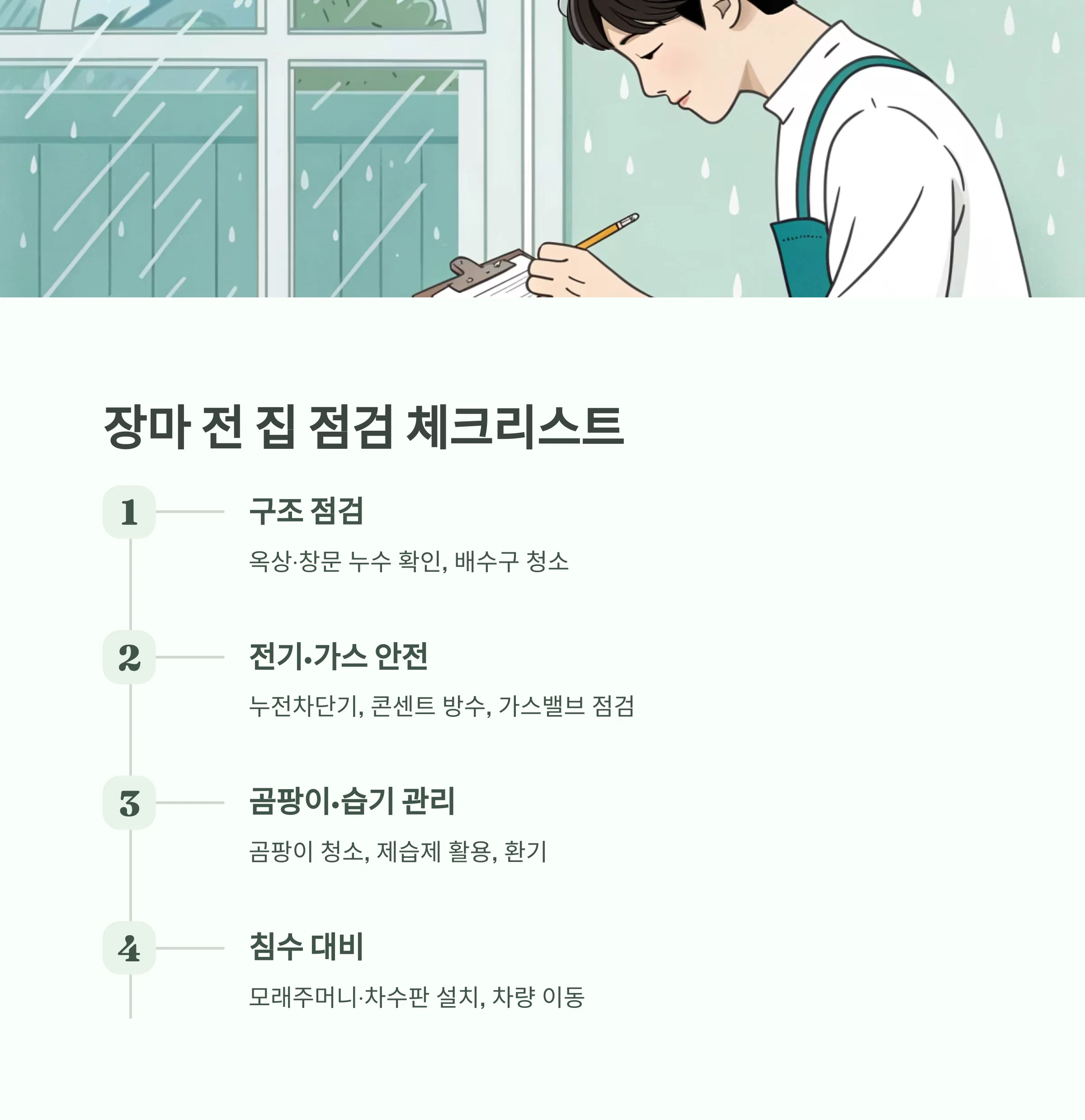 | 구조 점검 | 옥상·창문 누수 확인, 배수구 청소 |