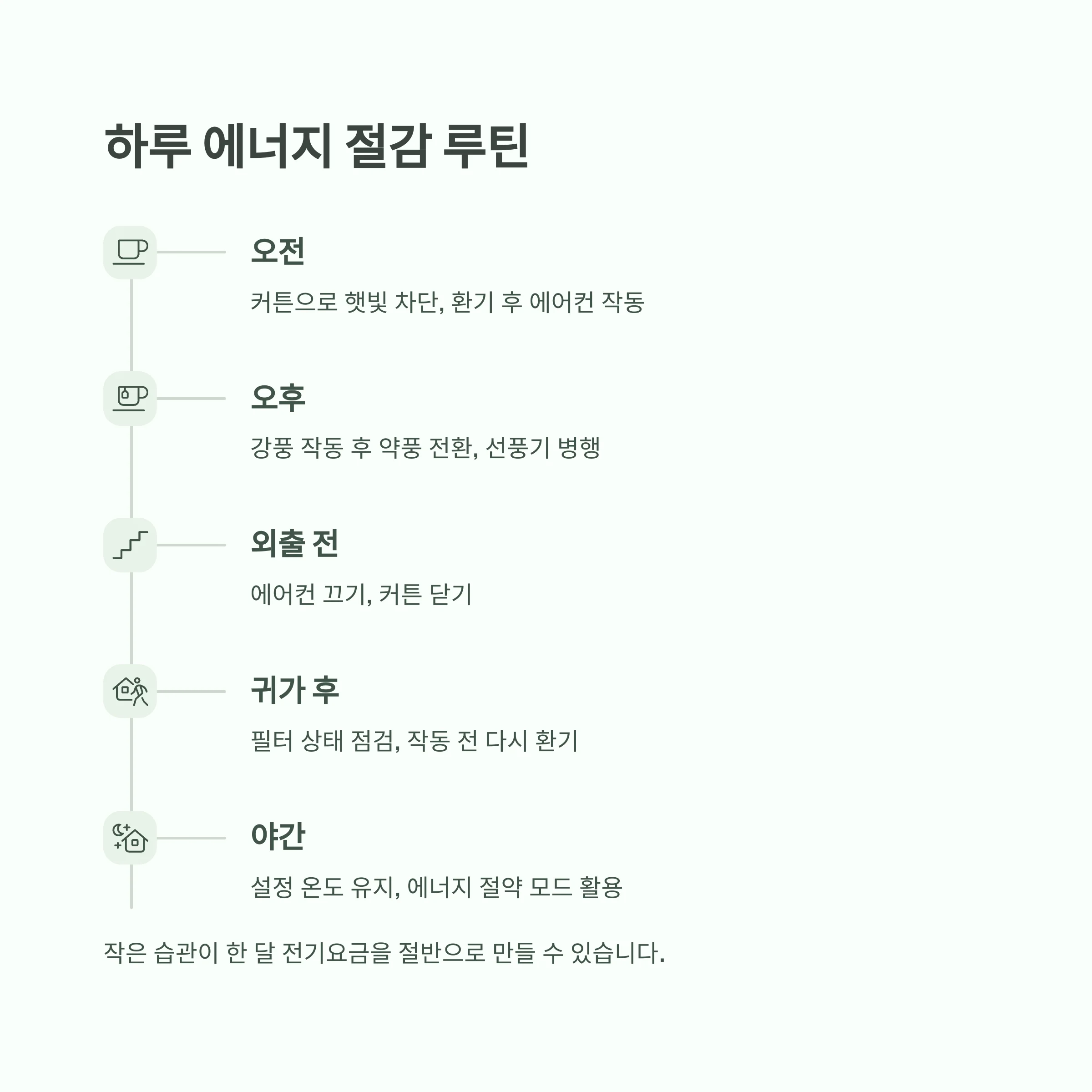온도 설정, 풍량 조절, 선풍기 병행, 필터 청소, 공간 분리 등의 간단한 실천만으로도