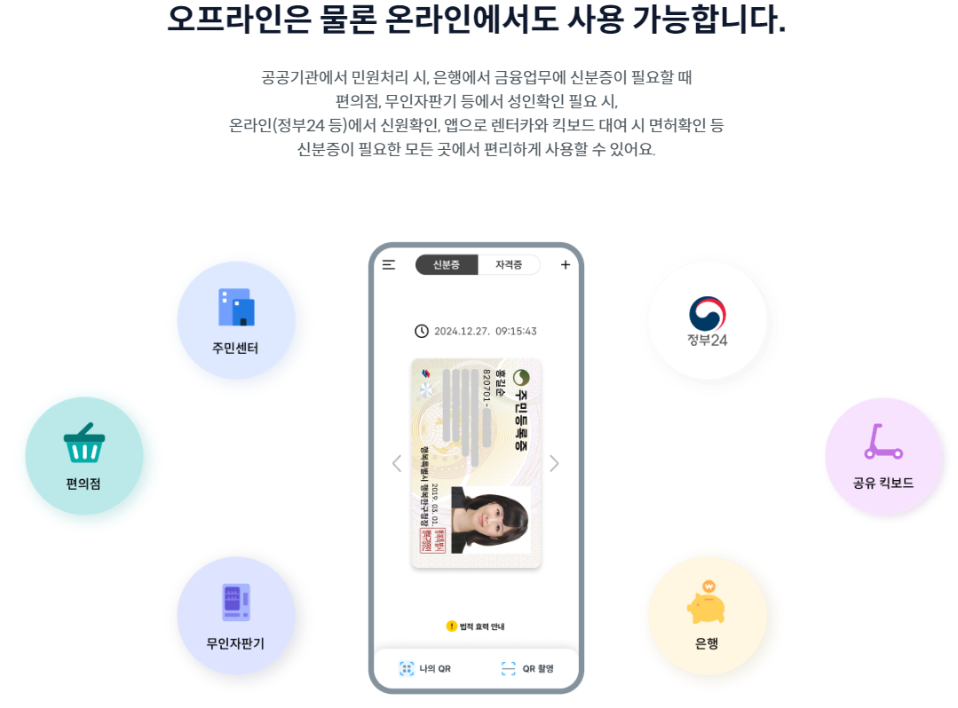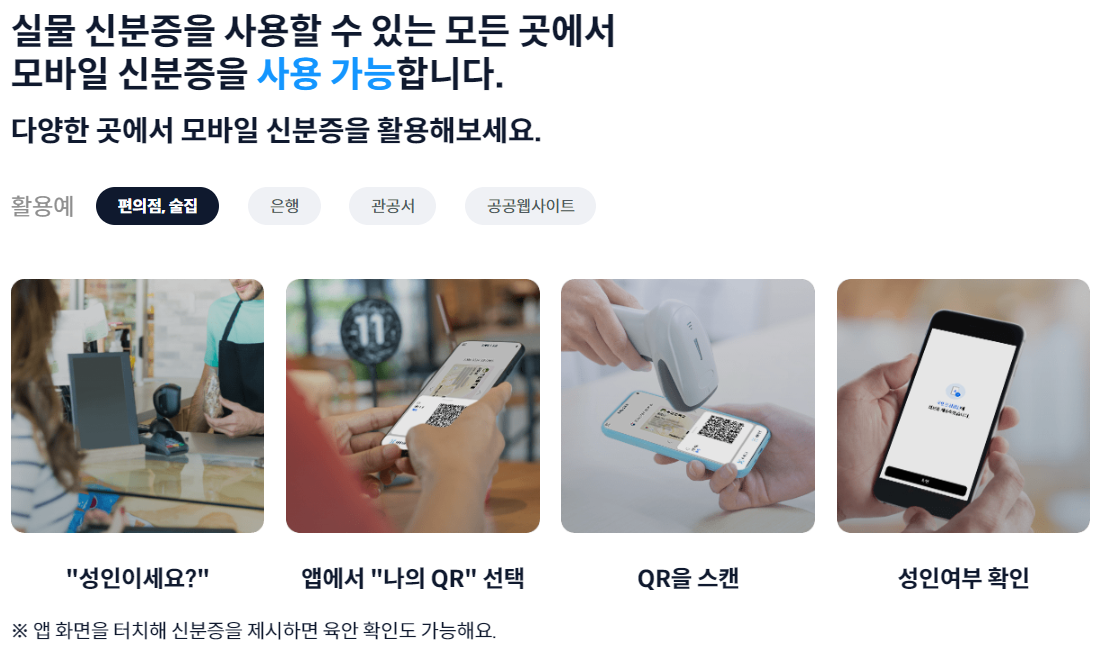 - 편의점 및 영화관: 성인 인증이 필요한 경우 모바일 신분증을 제시하여 인증할 수 있습니다 .