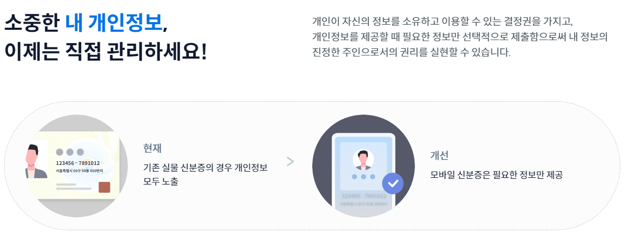 모바일 신분증은 **비대칭 암호화(PKI)**와 블록체인 기술을 적용하여 보안성을 강화하였습니다. 또한, 사용자는 신원 확인 시 필요한 정보만 선택적으로 제공할 수 있어 과도한 개인정보 노출을 방지할 수 있습니다 .