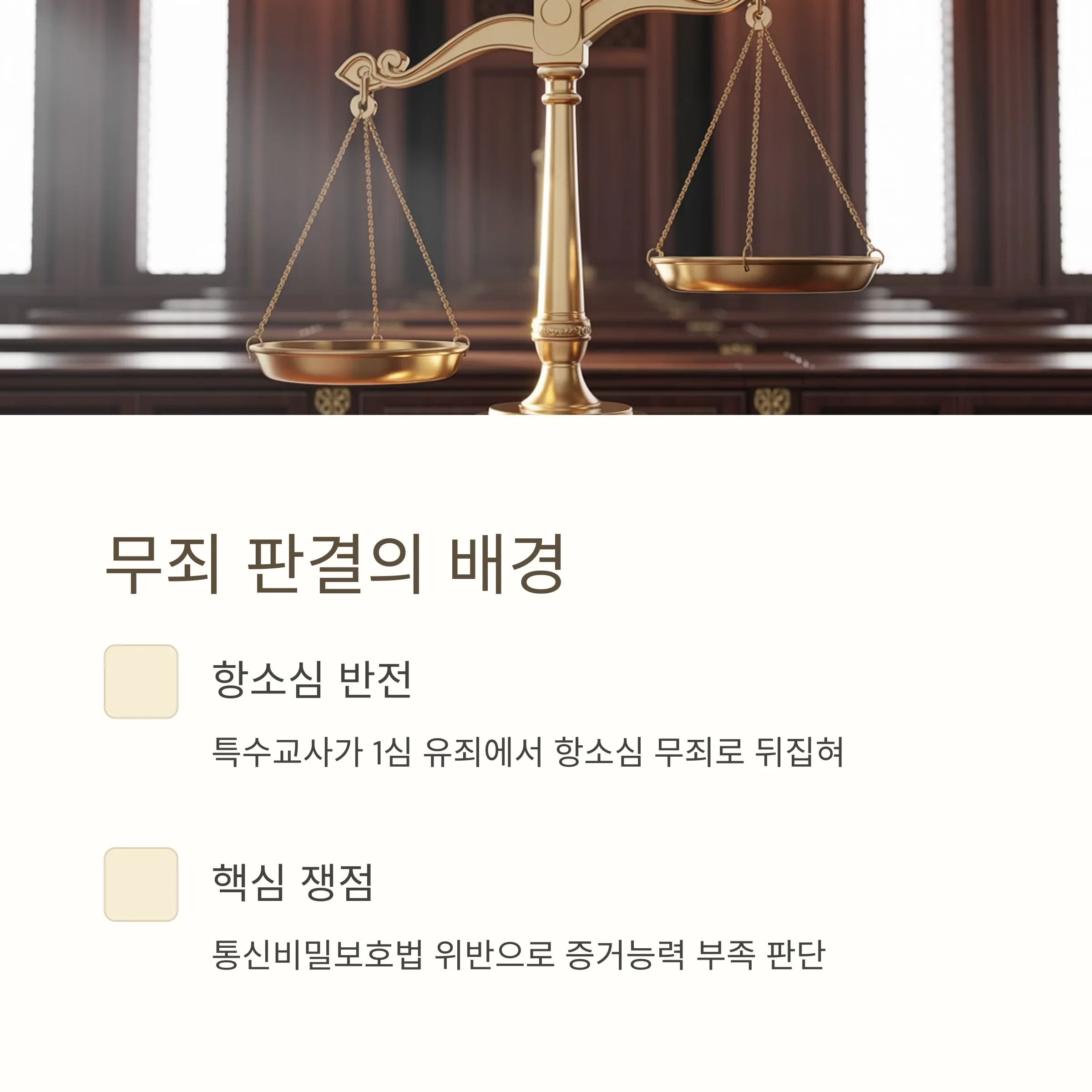 항소심 재판부는 1심에서 유죄로 인정됐던 핵심 증거에 대해 통신비밀보호법 위반에 따른 증거능력 부족을 지적하며, 사건의 방향을 뒤바꿨습니다.