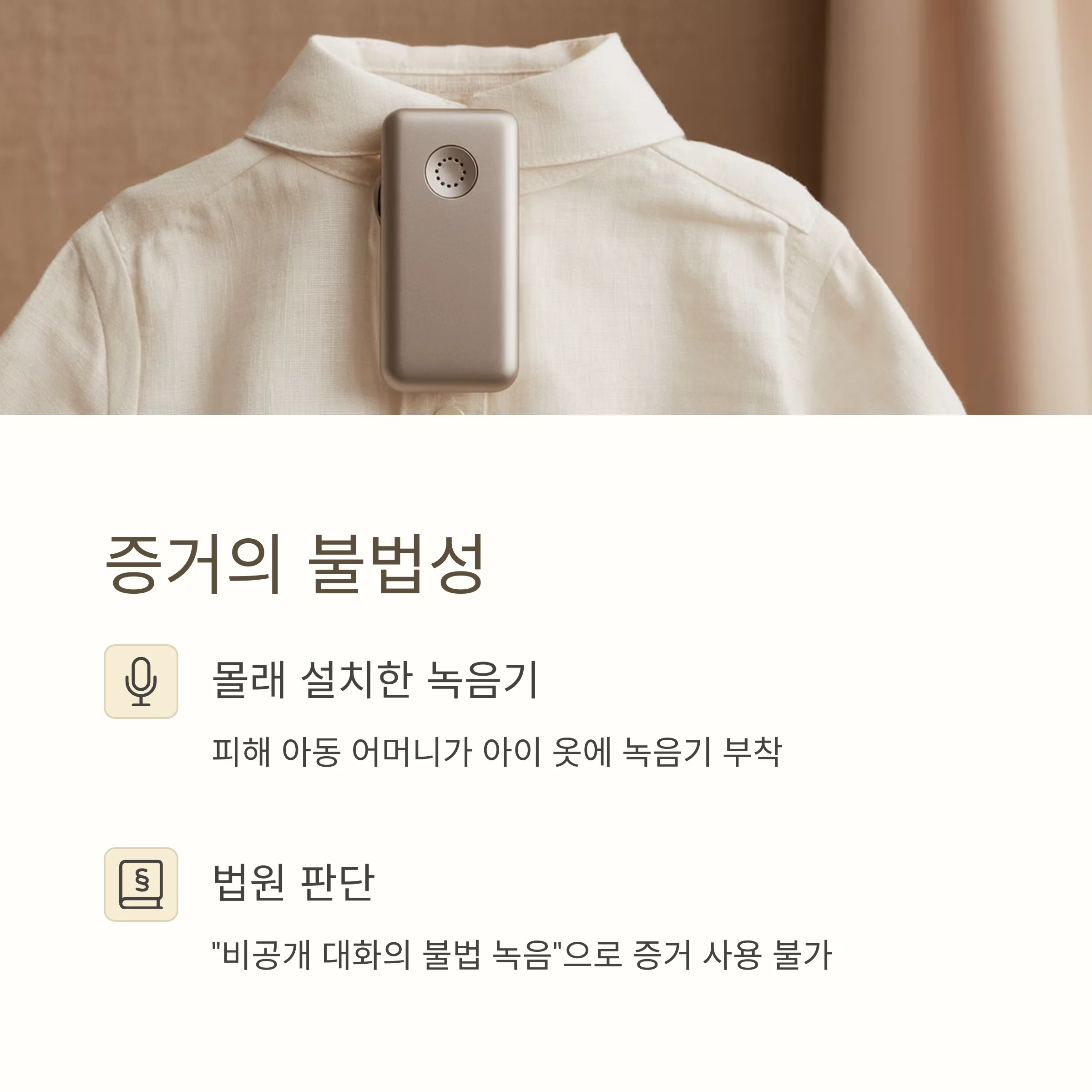 아동의 옷에 녹음기를 부착해 교사와의 대화를 몰래 녹음한 것은 "비공개 대화의 불법 녹음"으로 판단됐습니다.