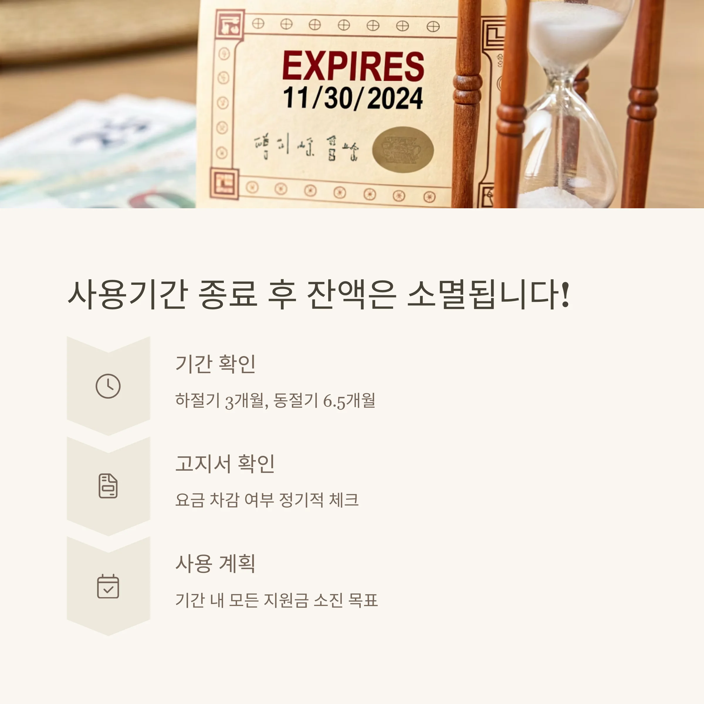 환불이나 이월은 불가능하므로 반드시 기간 내 사용을 완료해야 합니다.