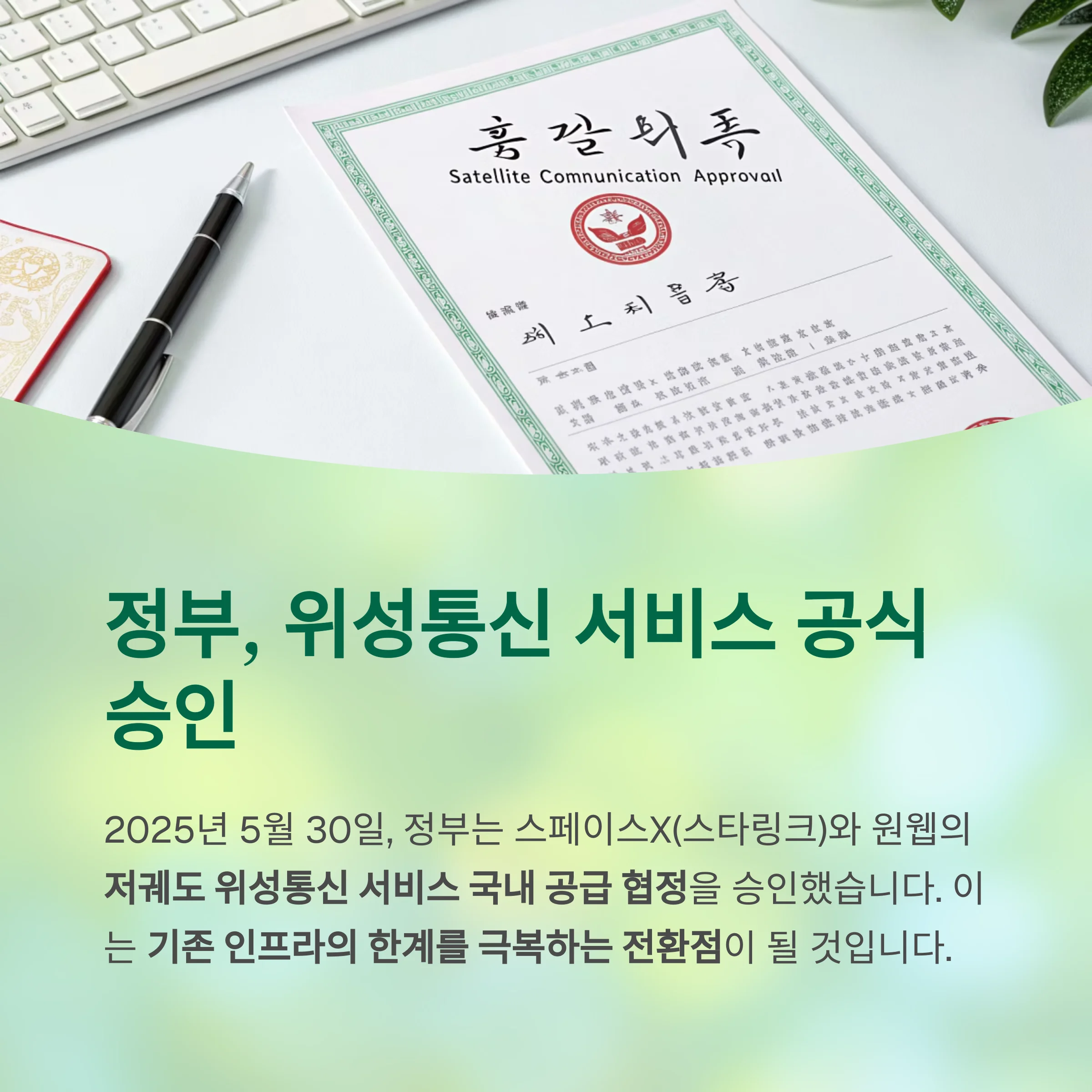 정부는 2025년 5월 30일, 스페이스X(스타링크)와 원웹의 저궤도 위성통신 서비스 국내 공급 협정을 공식 승인했습니다.