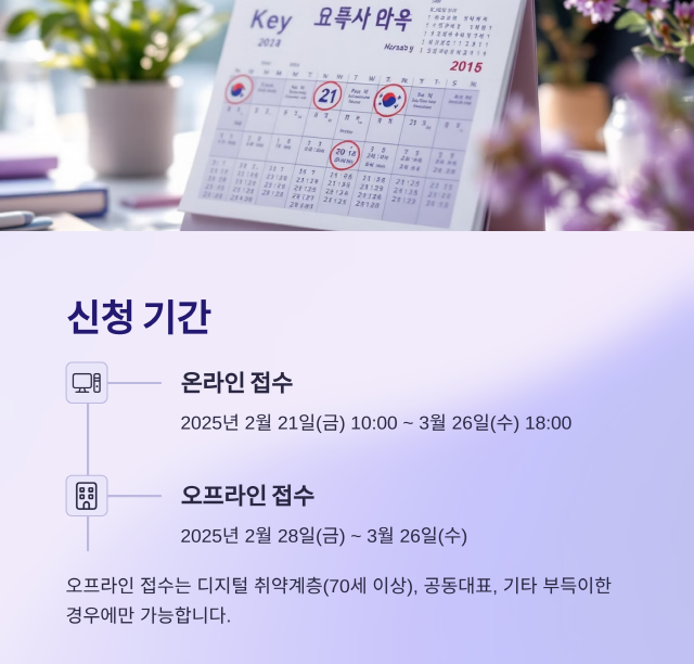 - 오프라인 접수(방문 신청): 2025년 2월 28일(금) ~ 3월 26일(수)