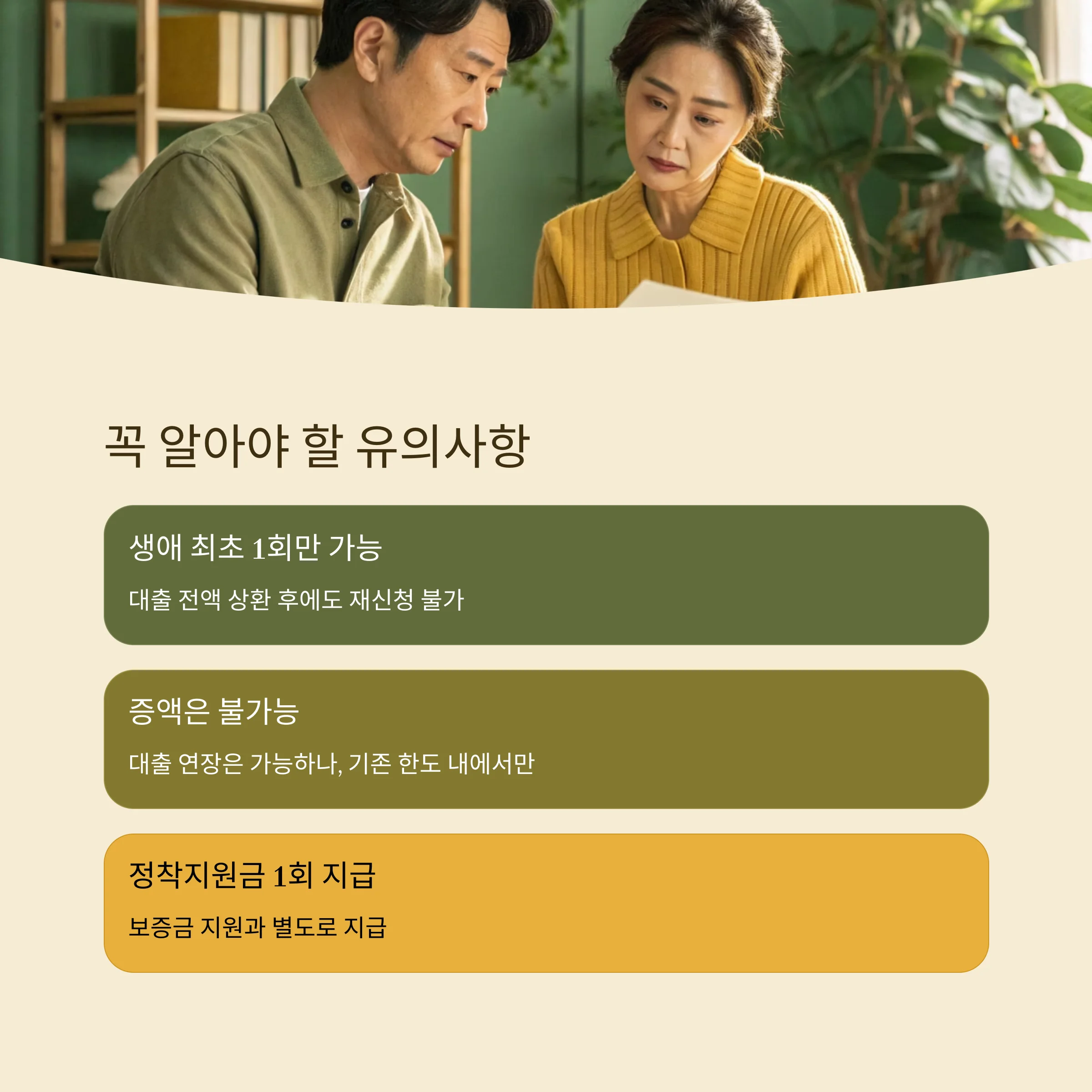 - 생애 최초 1회만 가능: 대출 전액 상환 후에도 재신청 불가