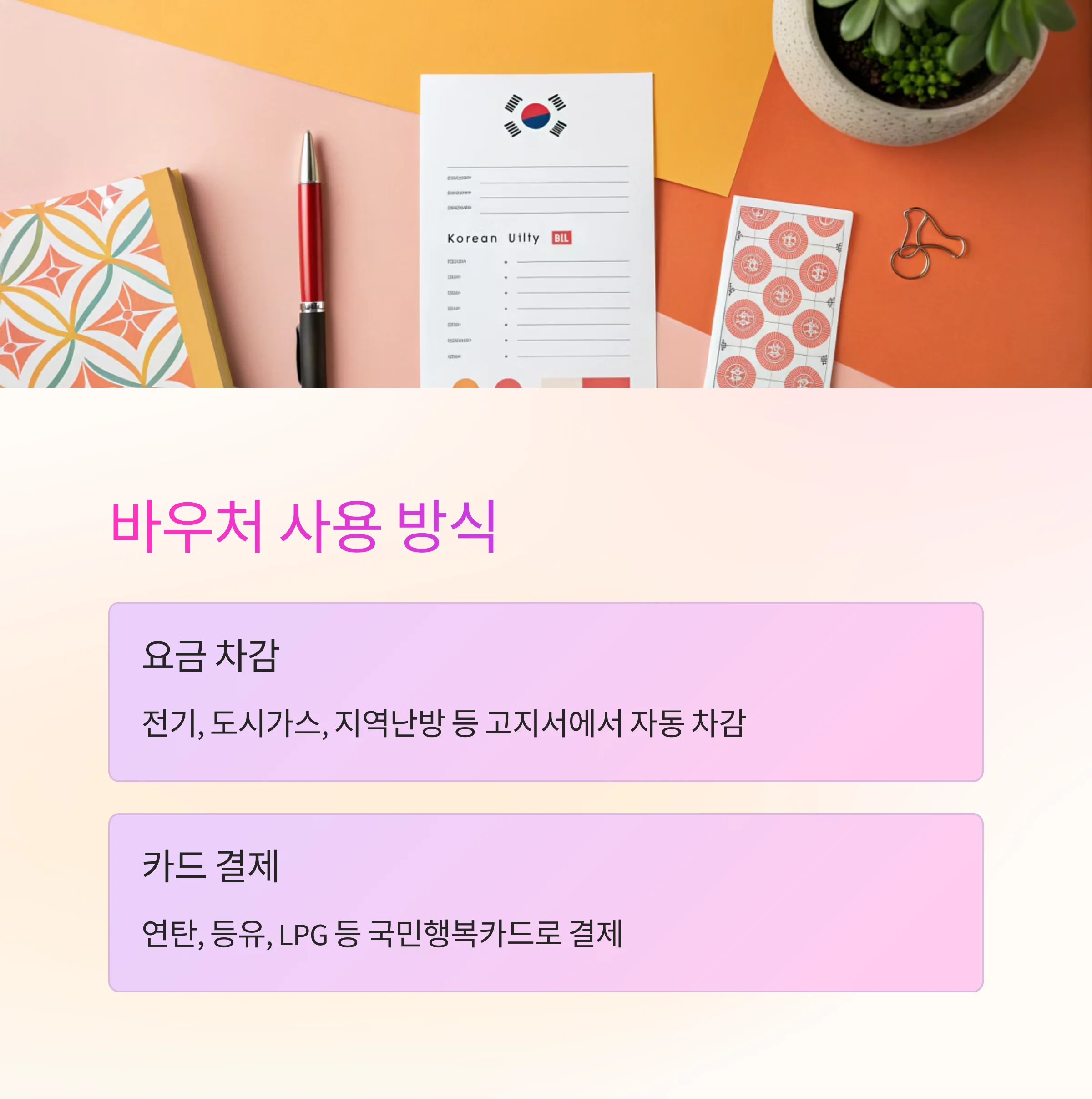 | 카드 결제 | 연탄, 등유, LPG 등 | 국민행복카드 실물 또는 모바일 결제 |