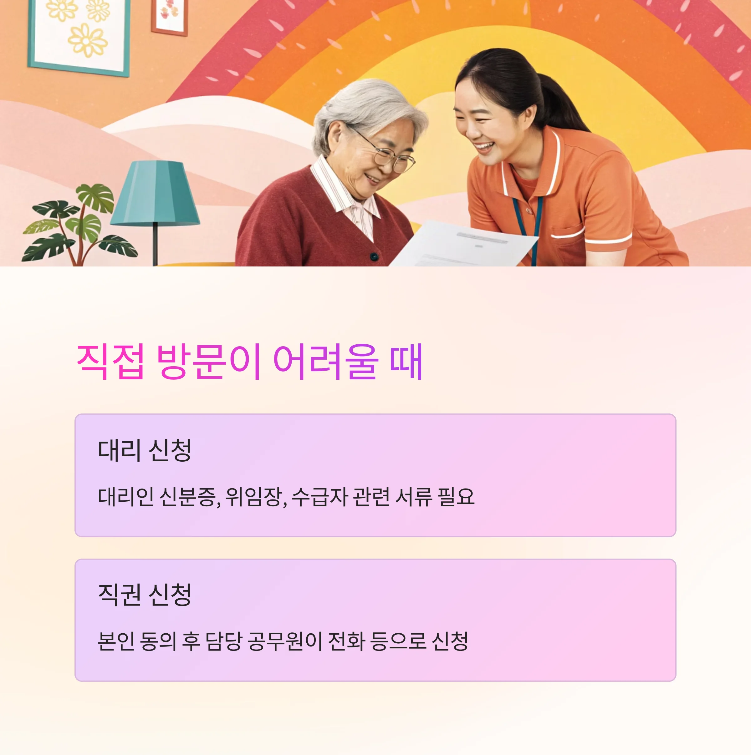 | 대리 신청 | 대리인 신분증, 위임장, 수급자 관련 서류 |