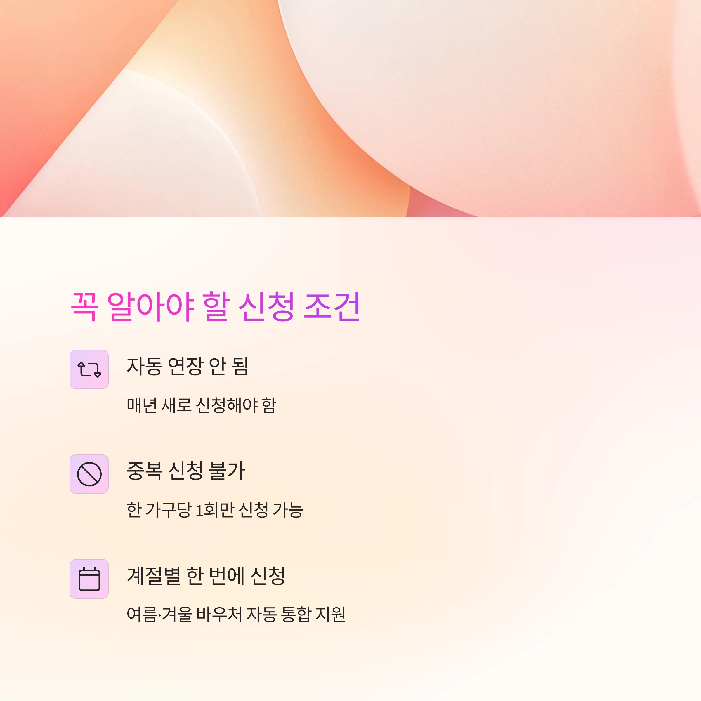 "자동 연장 안 됨": 매년 새로 신청해야 하며, 작년에 받았다고 올해 자동 지원은 없습니다.
