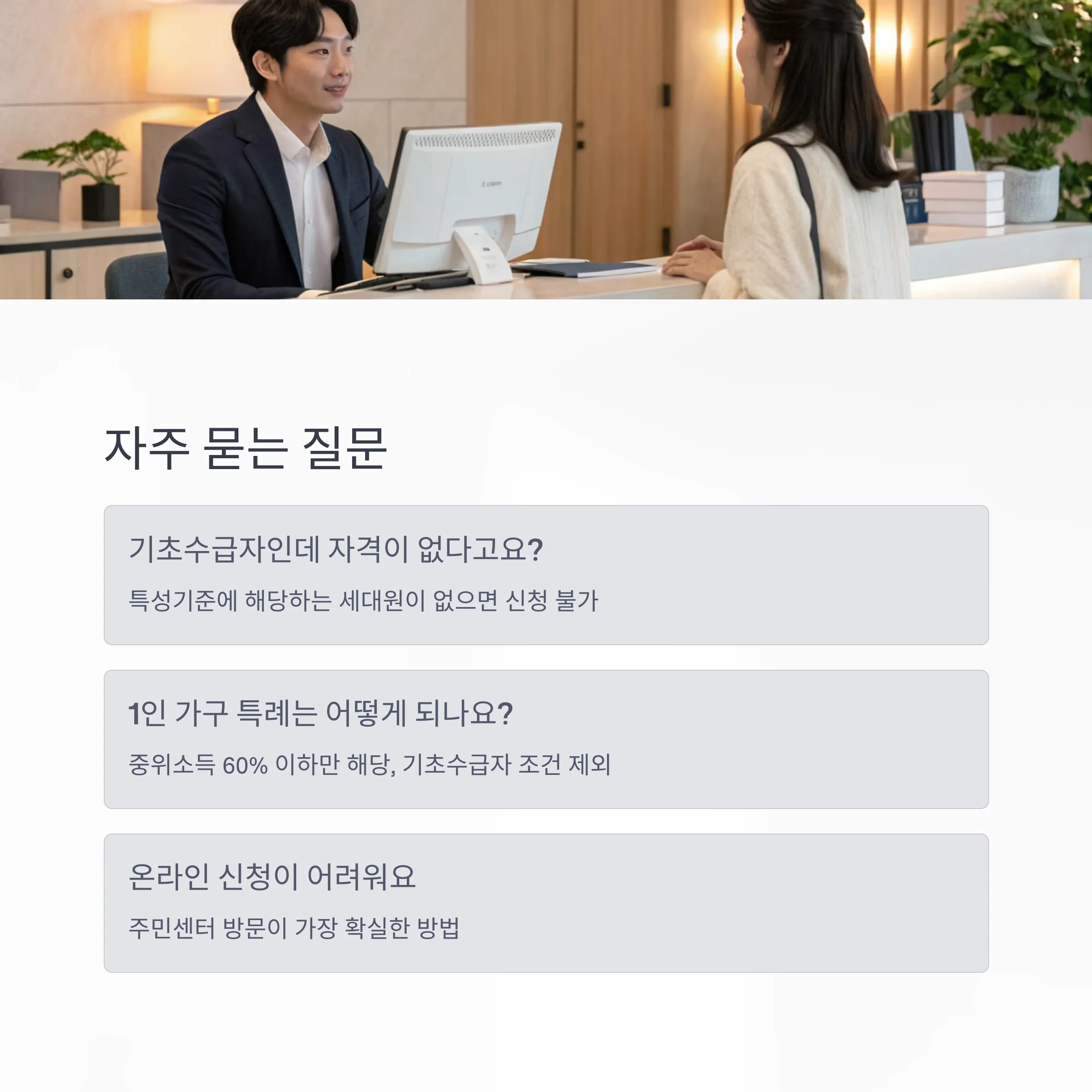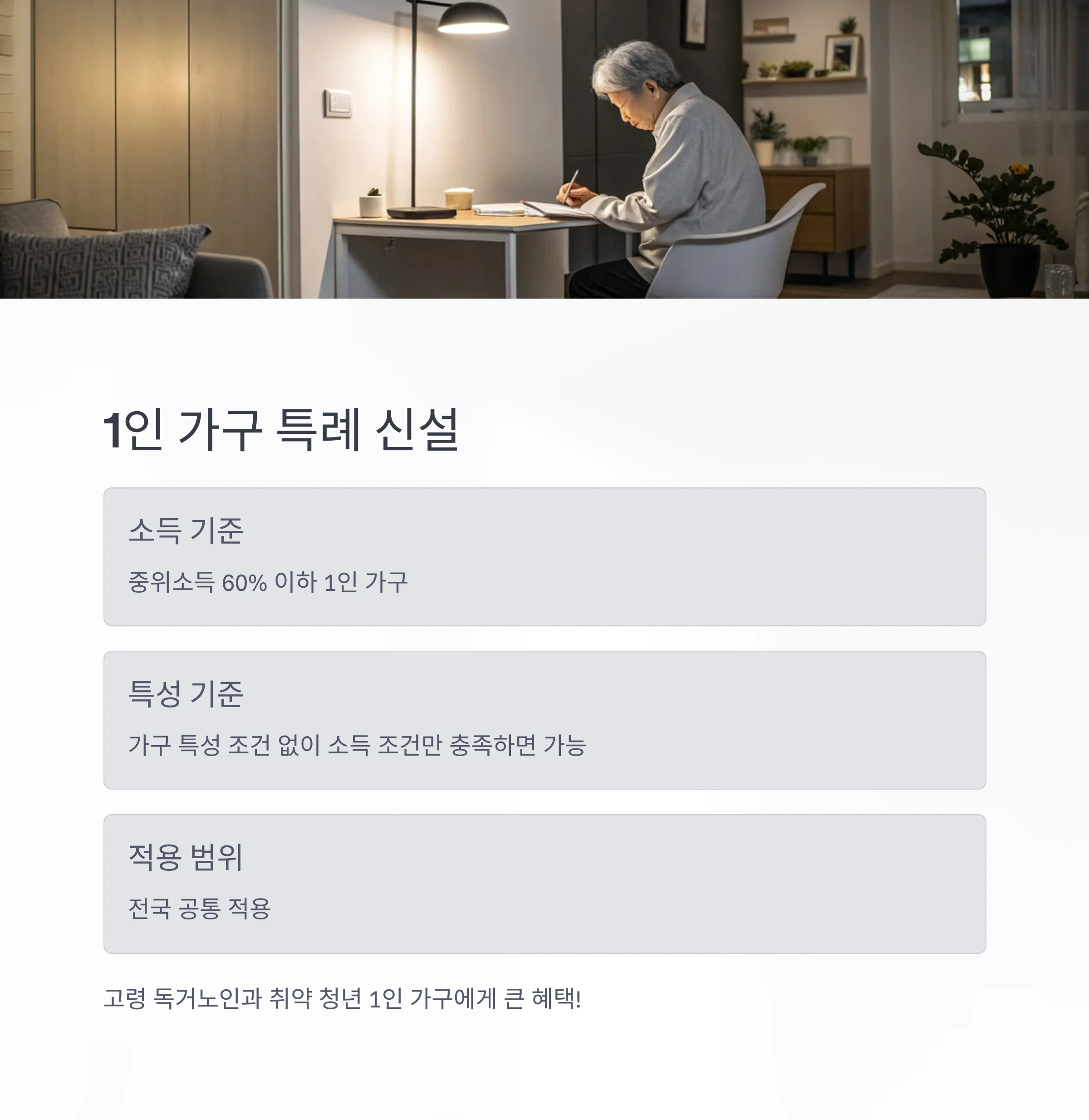 → 1인 가구 특례는 중위소득 60% 이하만 해당되며, 기초수급자 조건은 제외됩니다.