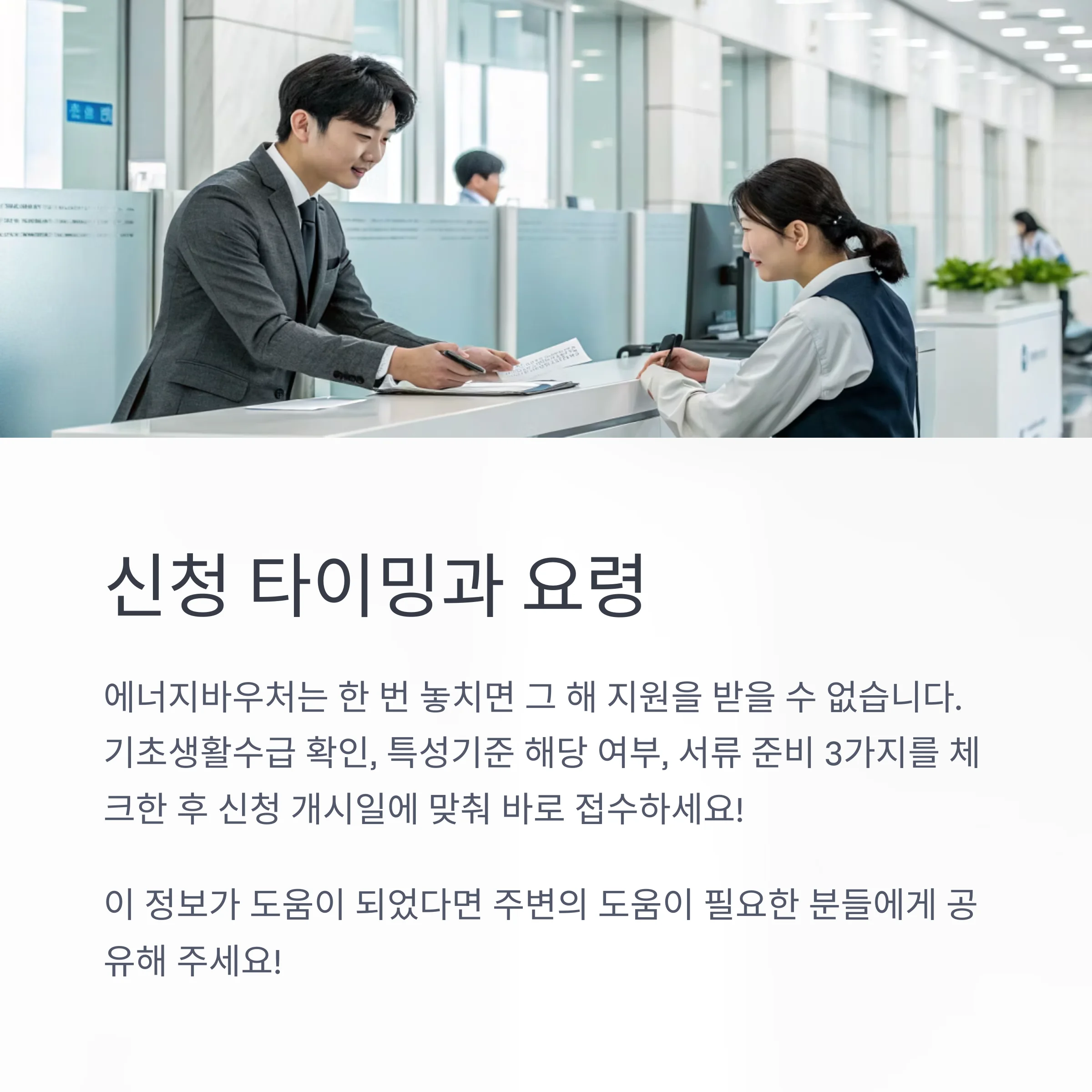 에너지바우처 신청은 한 번 놓치면 그 해 지원을 받을 수 없습니다.