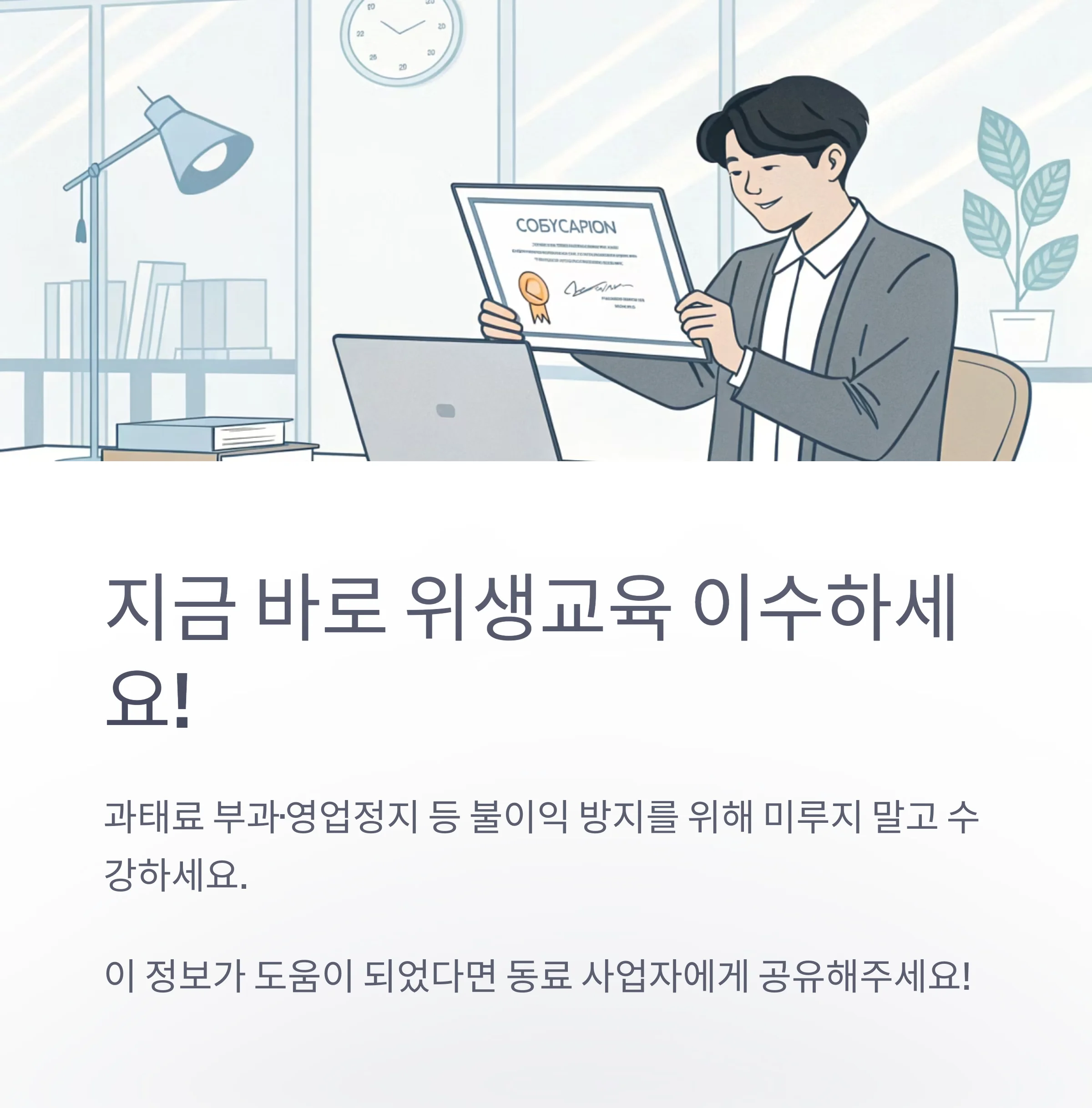 - 과태료 부과·영업정지 등 불이익 방지를 위해 미루지 말고 수강 필수