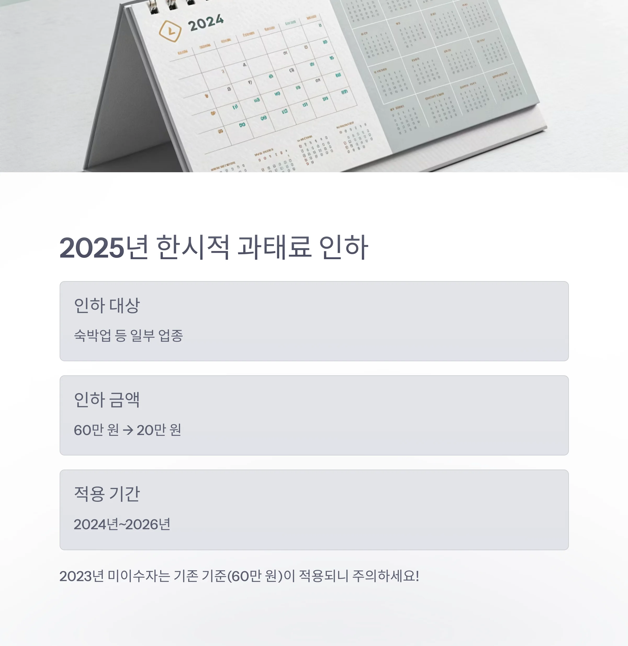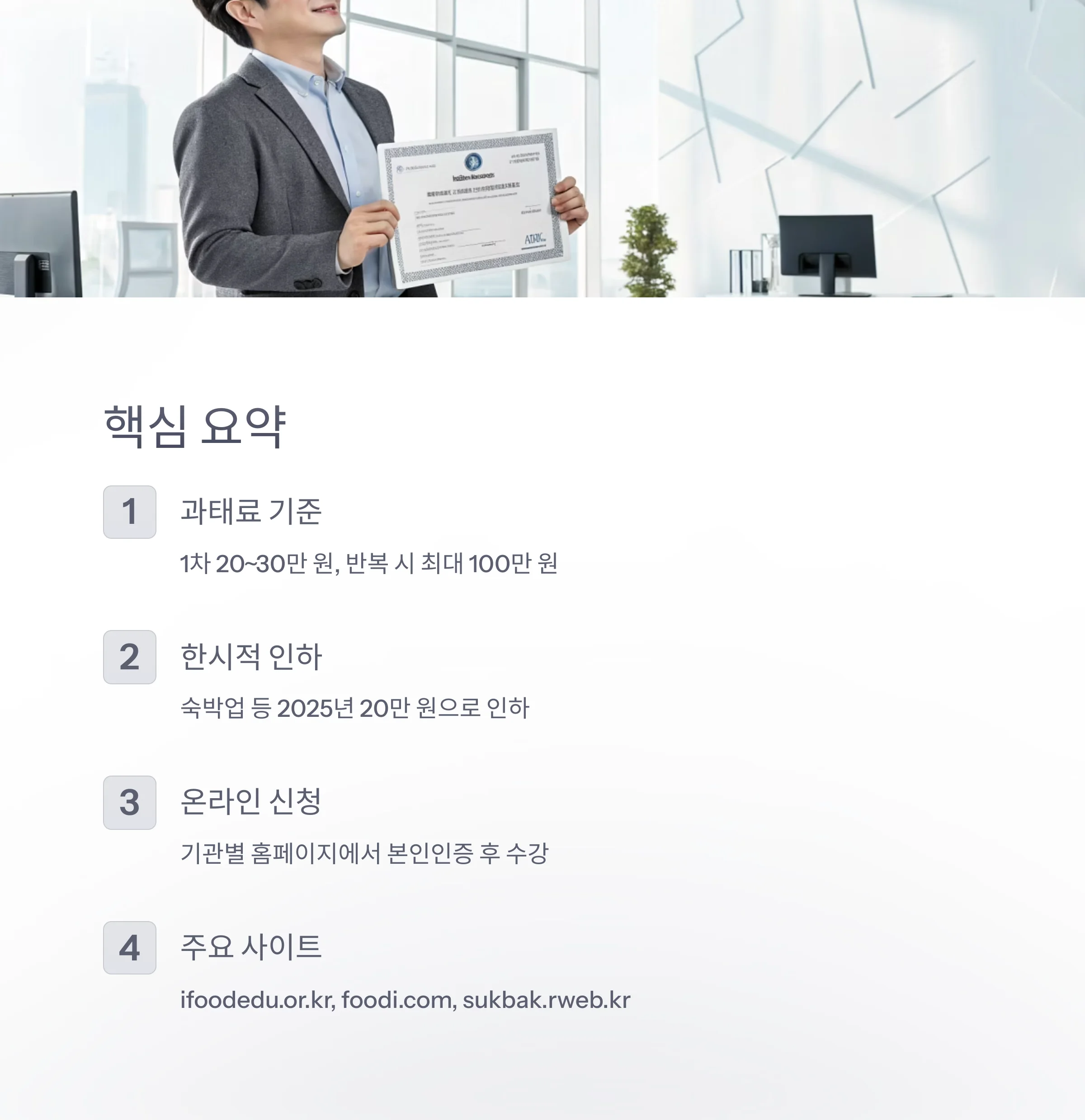 - 숙박업 등 일부 업종은 2025년 한시적으로 과태료가 20만 원으로 인하