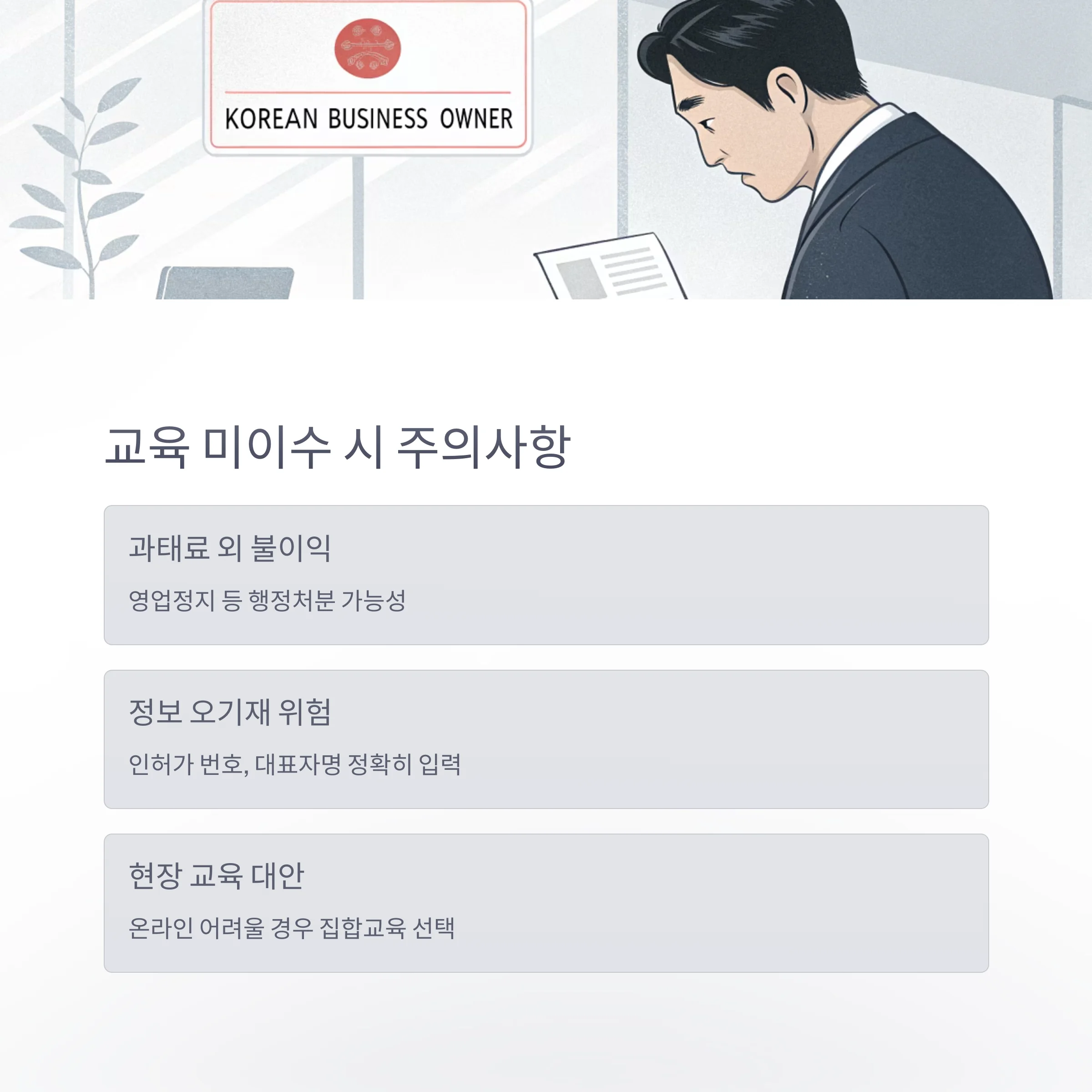 교육 이수 여부는 인허가 번호와 대표자명 등으로 검증되므로 오기재도 위험 요소입니다.