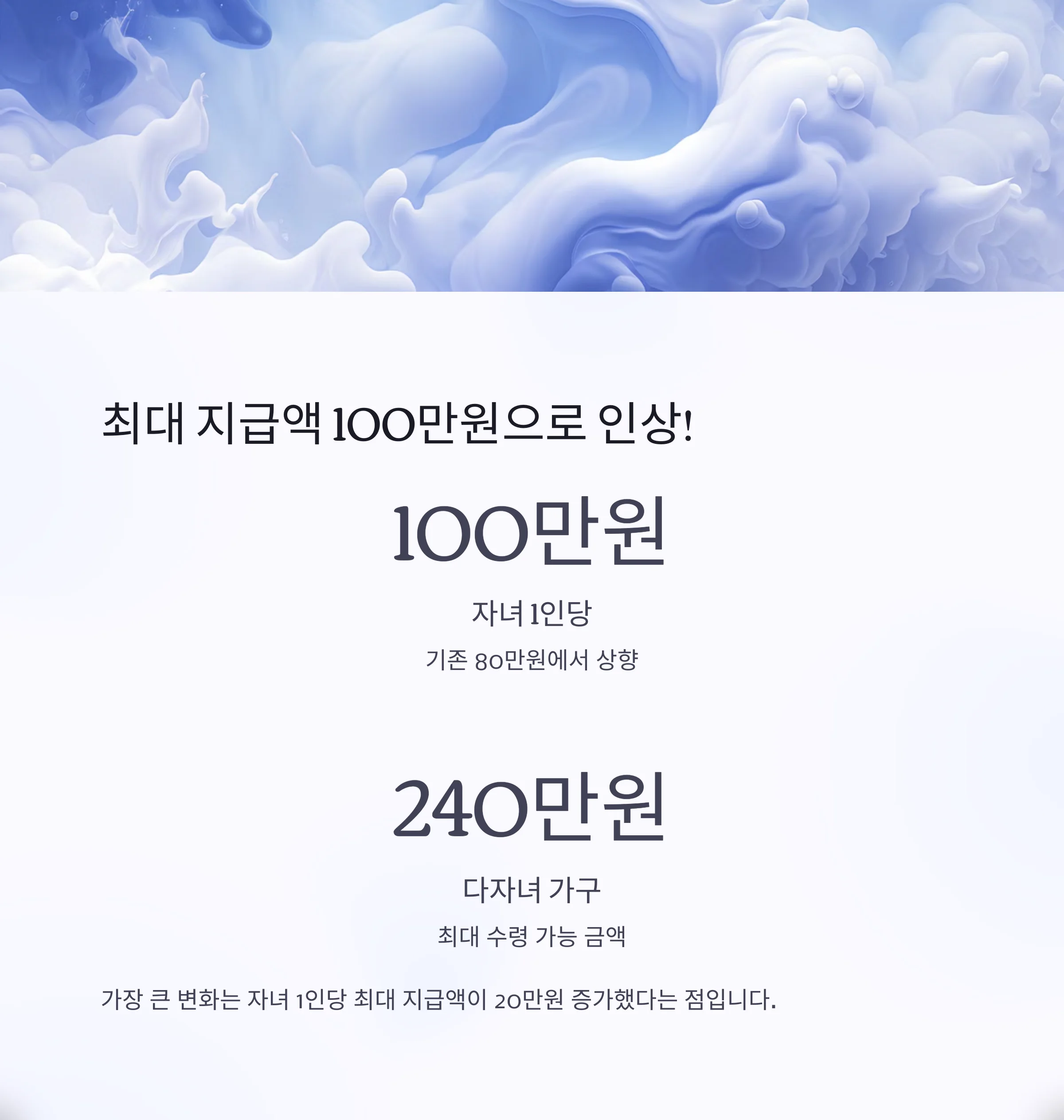 가장 큰 변화 중 하나는 자녀 1인당 최대 지급액이 기존 80만 원에서 100만 원으로 상향된 점입니다.