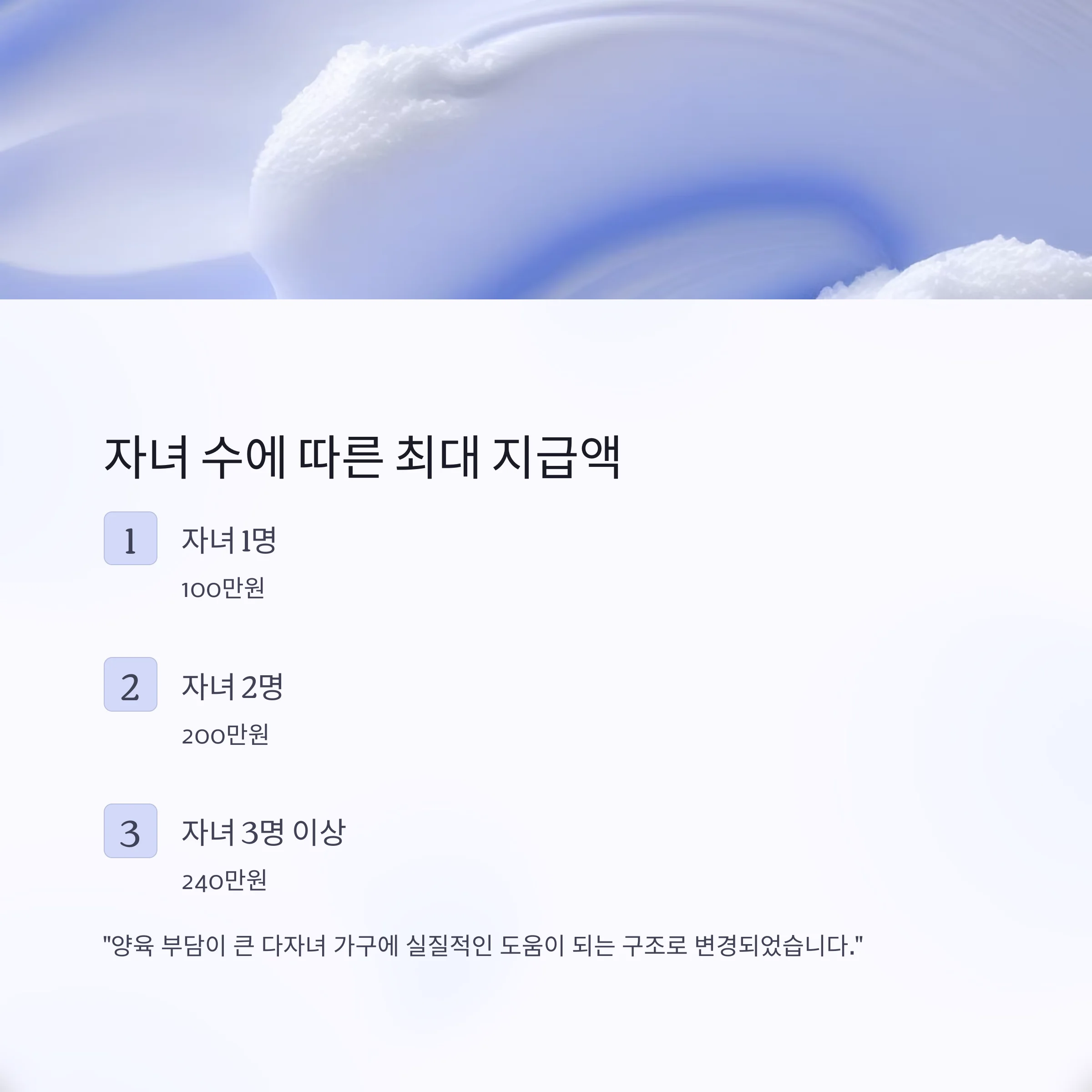 다자녀 가구는 최대 240만 원까지 수령 가능해졌습니다.
