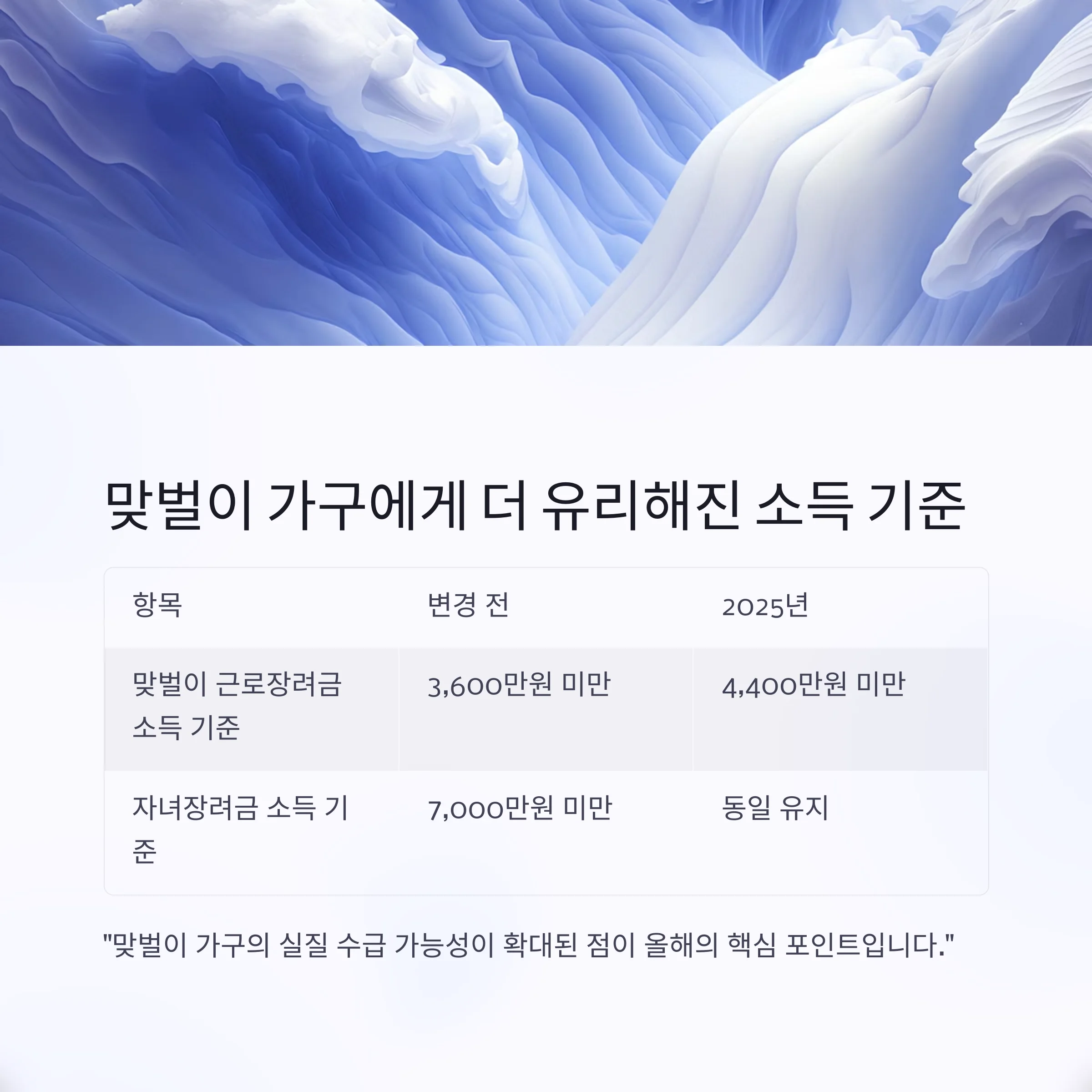 근로장려금 기준이 완화되면서 자녀장려금 동시 수급 가능성이 증가했습니다.