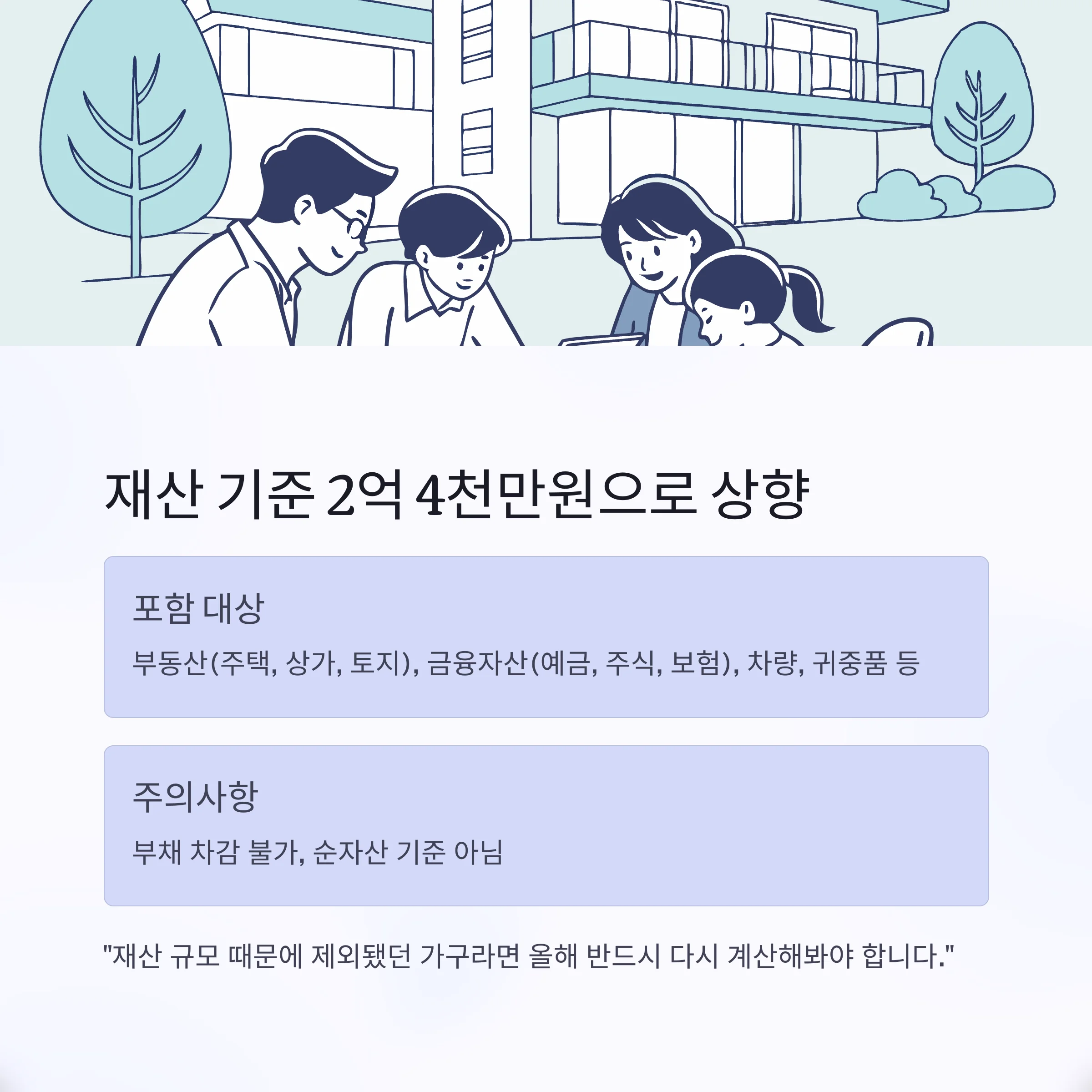 2025년부터는 재산 기준이 2억 4천만 원 미만으로 상향되었습니다.