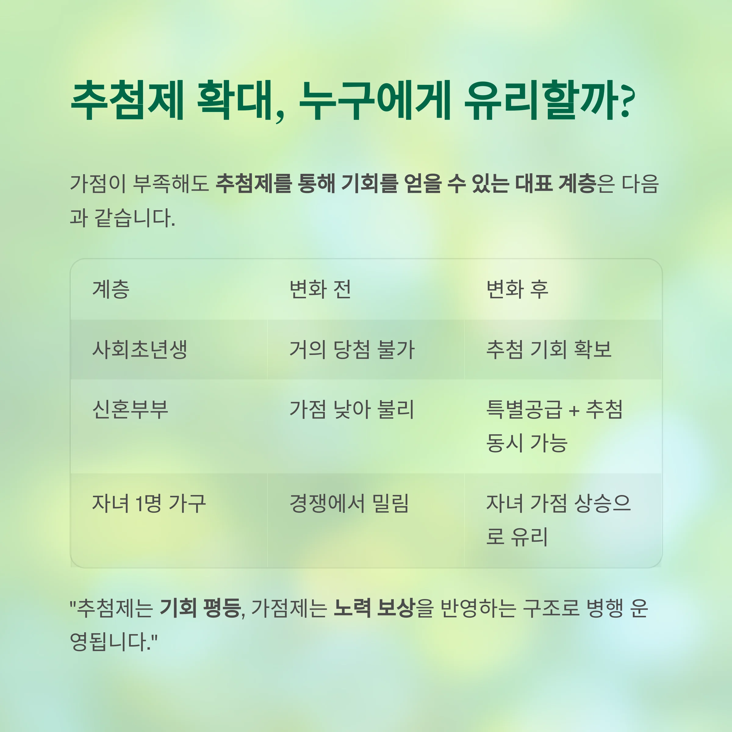 "추첨제는 기회 평등, 가점제는 노력 보상을 반영하는 구조로 병행 운영됩니다."