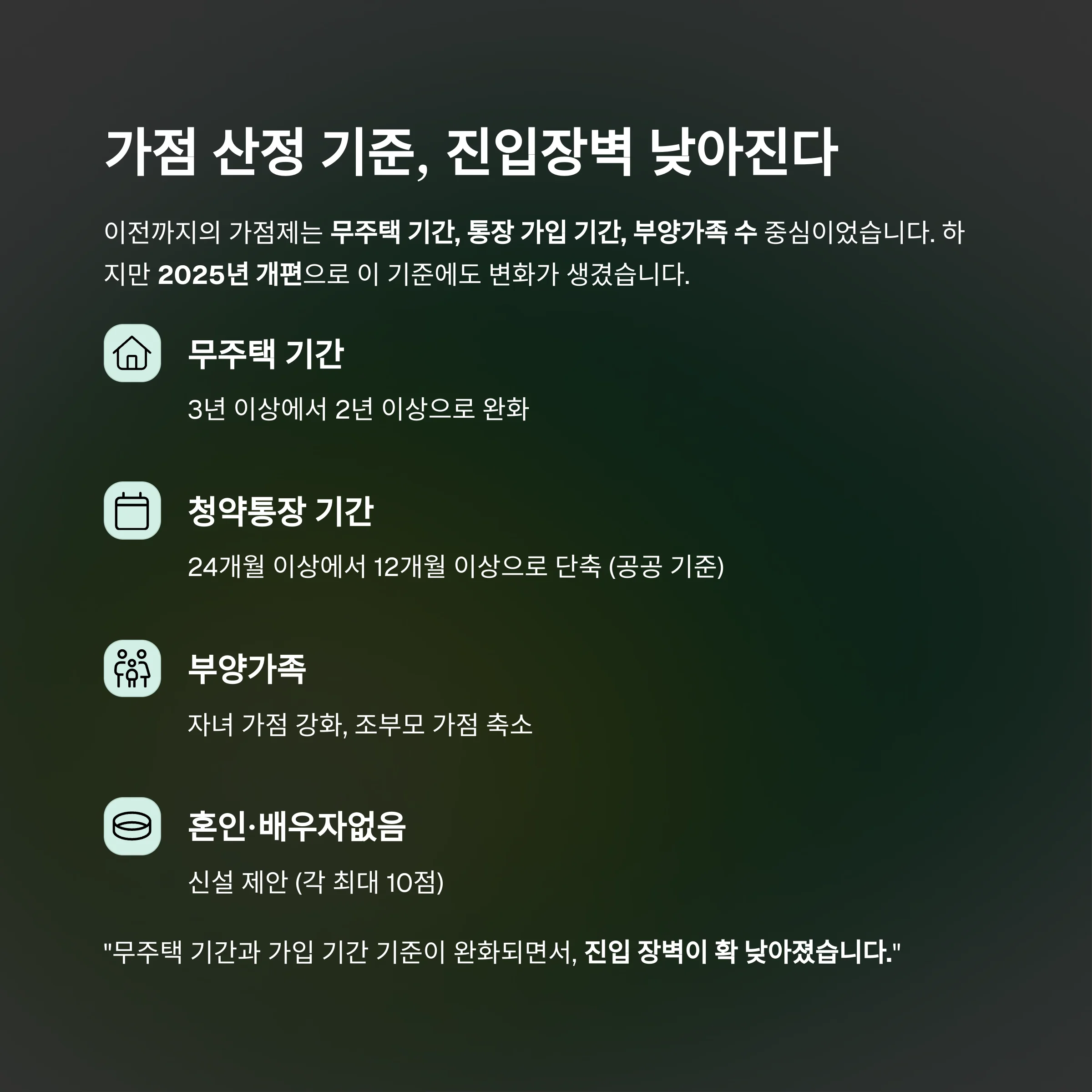 이전까지의 가점제는 무주택 기간, 통장 가입 기간, 부양가족 수 중심이었습니다. 하지만 2025년 개편으로 이 기준에도 변화가 생겼습니다.