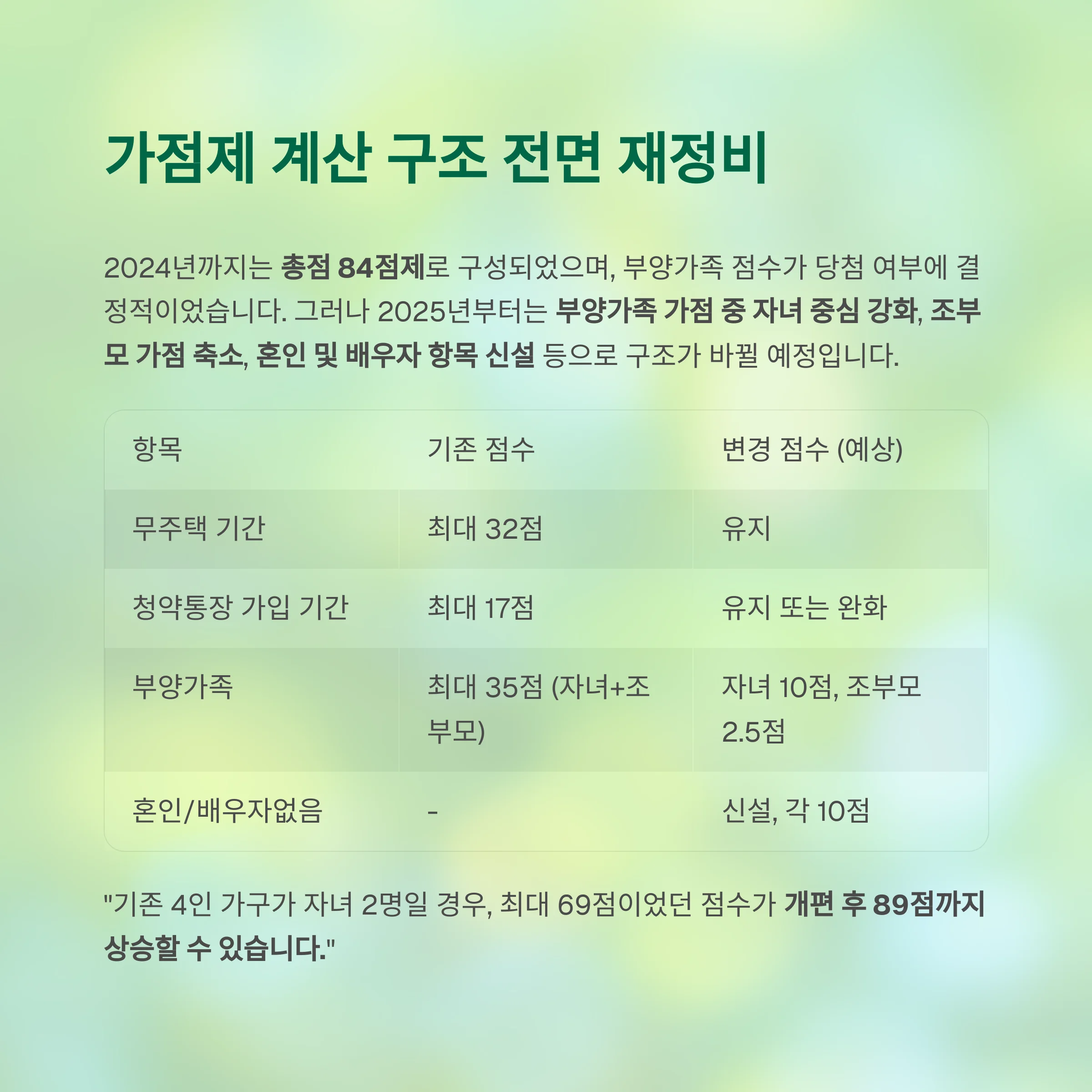 | 부양가족 | 자녀 및 조부모 포함 | 자녀 가점 강화, 조부모 가점 축소 |