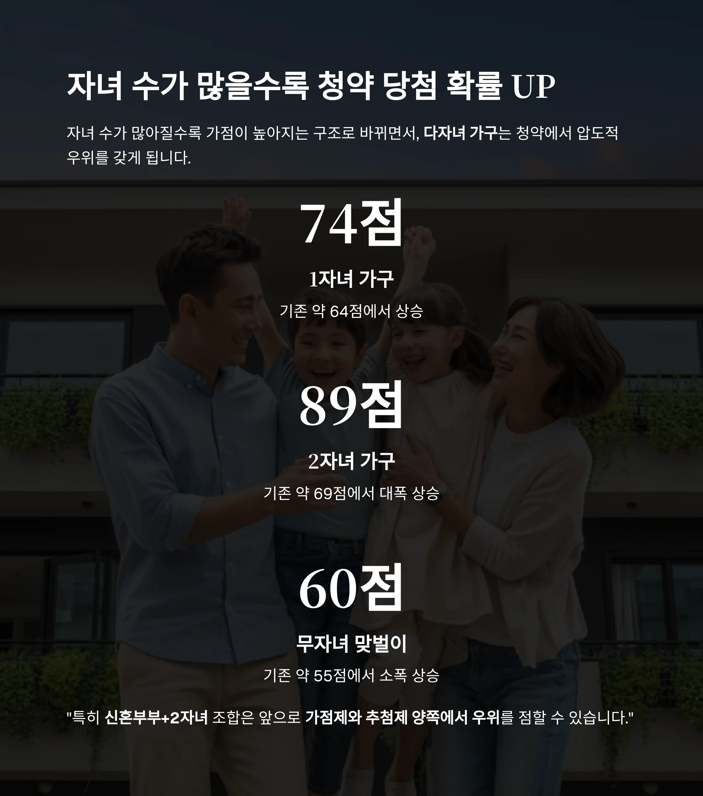 자녀 수가 많아질수록 가점이 높아지는 구조로 바뀌면서, 다자녀 가구는 청약에서 압도적 우위를 갖게 됩니다.
