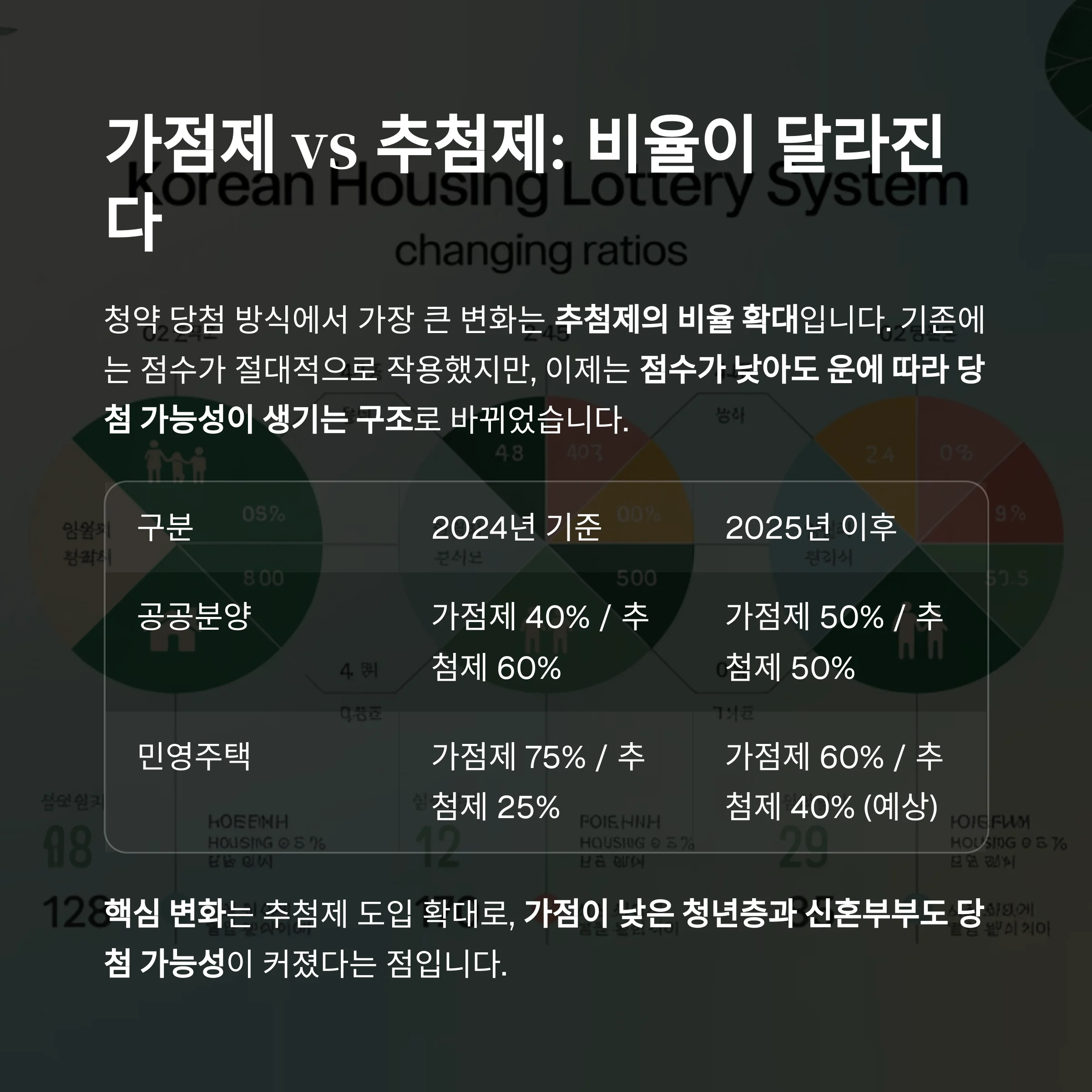 | 민영주택 | 가점제 75% / 추첨제 25% | 가점제 60% / 추첨제 40% (예상) |
