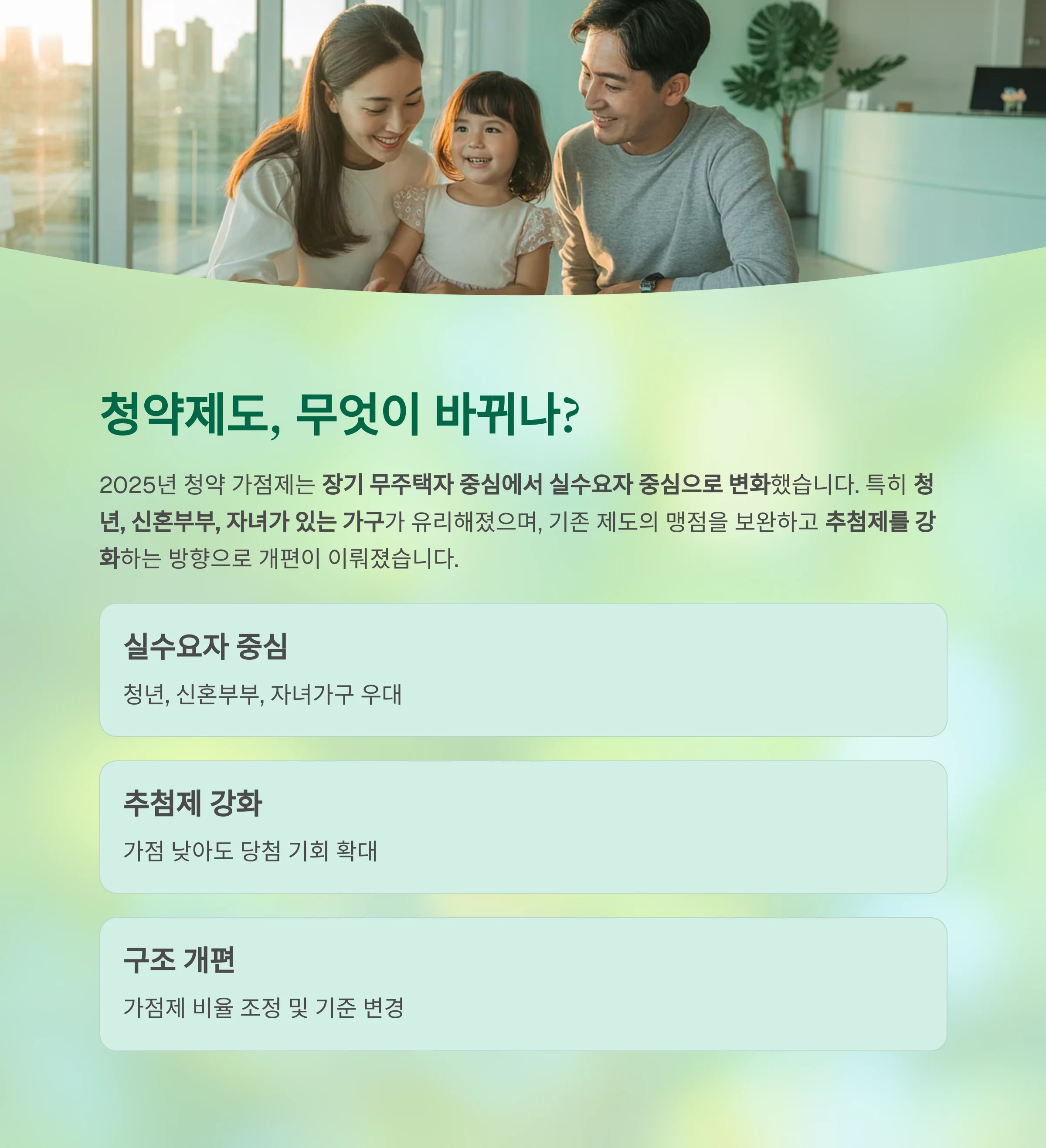 2025년 청약 가점제 개편은 기존의 점수 중심 제도에서 다양성과 형평성을 고려한 구조로 이동하고 있습니다.