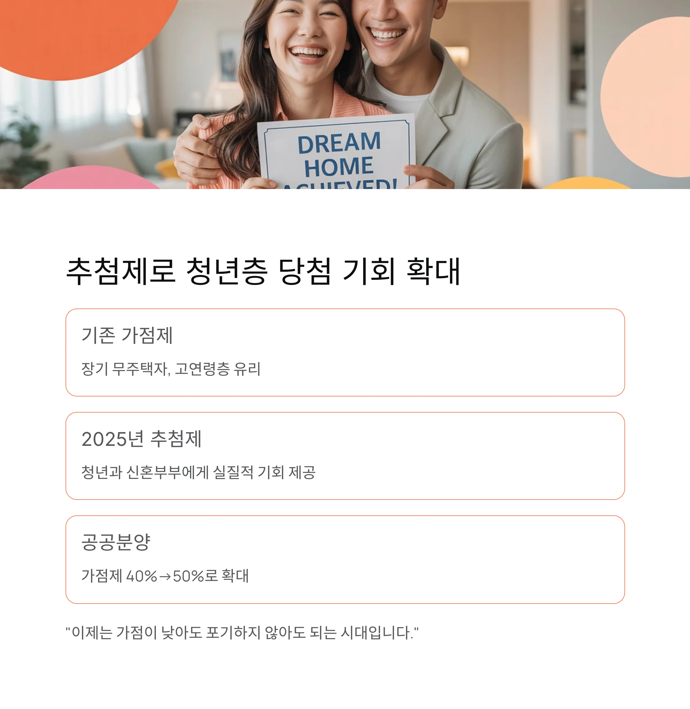 하지만 2025년부터는 추첨제 비율이 대폭 확대되면서, 청년과 신혼부부 등 가점이 낮은 계층도 실제 당첨 가능성이 생겼습니다.