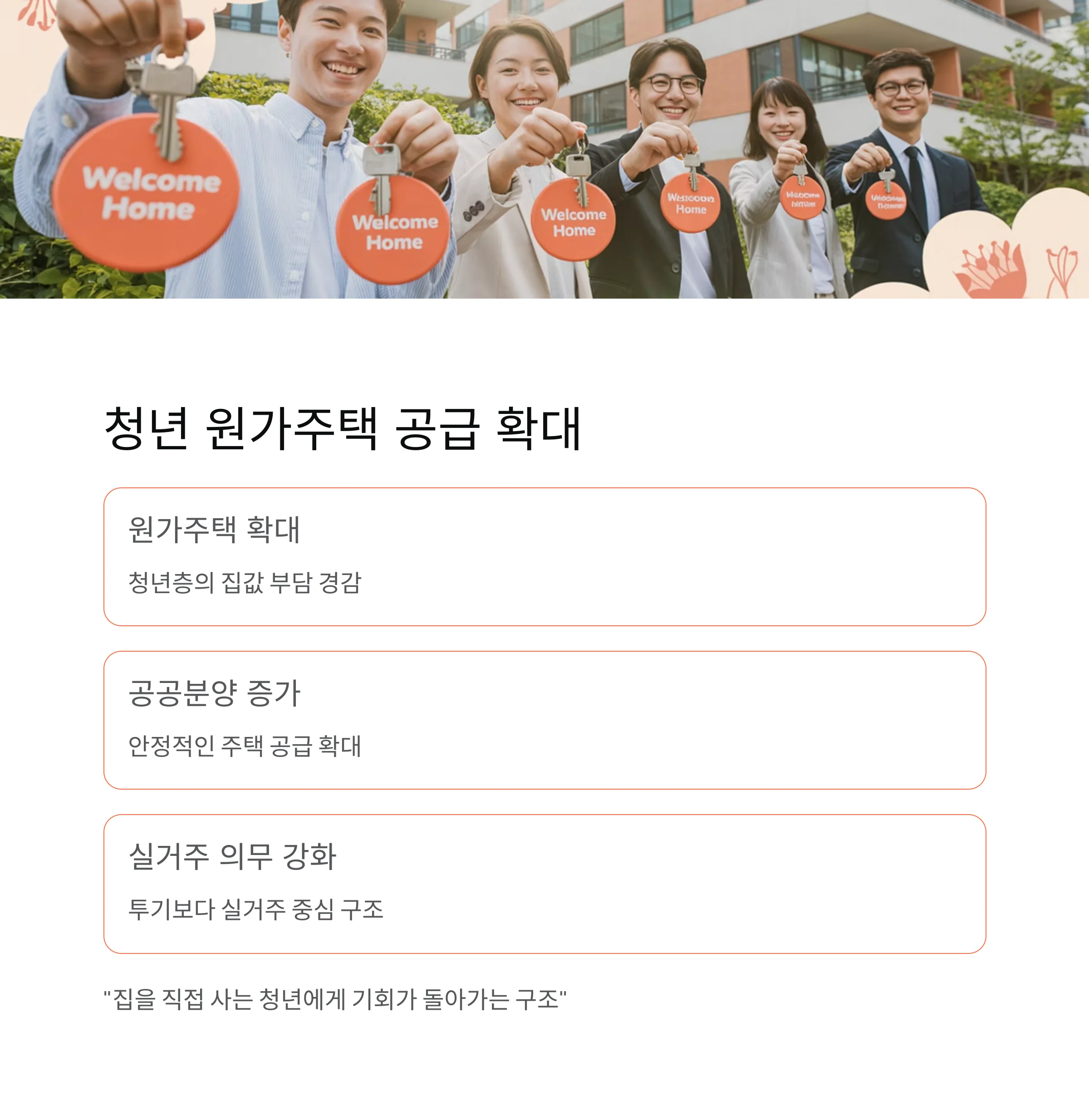 정부는 청년을 위한 원가주택 및 공공분양 확대 정책도 병행합니다.