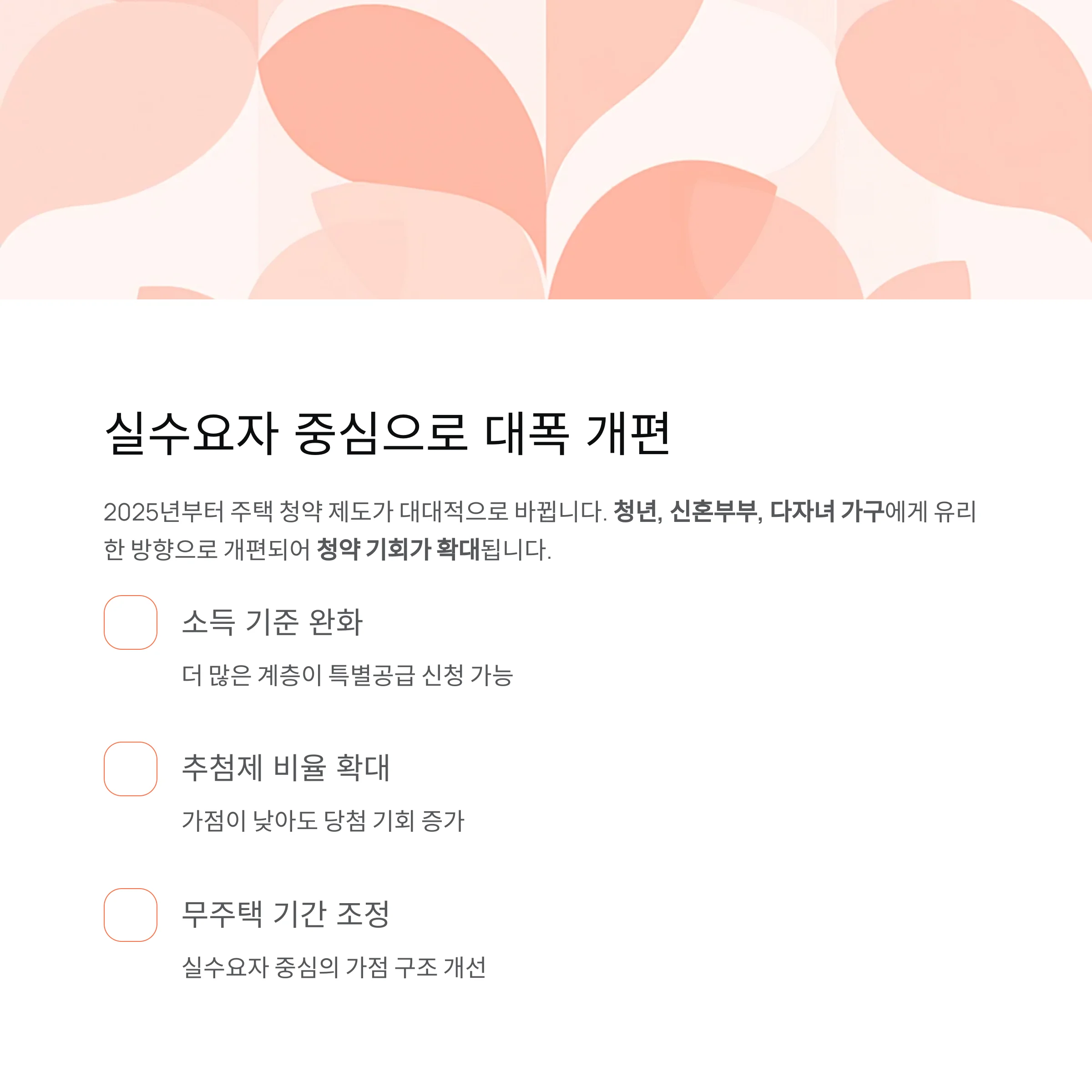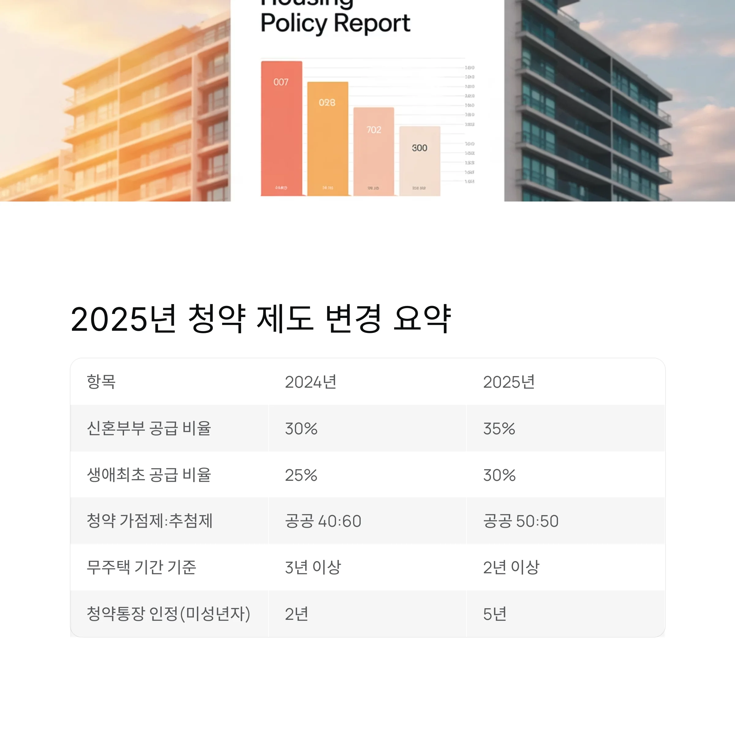 2025년부터 주택 청약 제도가 대대적으로 개편됩니다. 이번 개정은 실수요자 중심으로 설계되어 특히 청년, 신혼부부, 다자녀 가구에게 유리한 방향으로 바뀝니다.