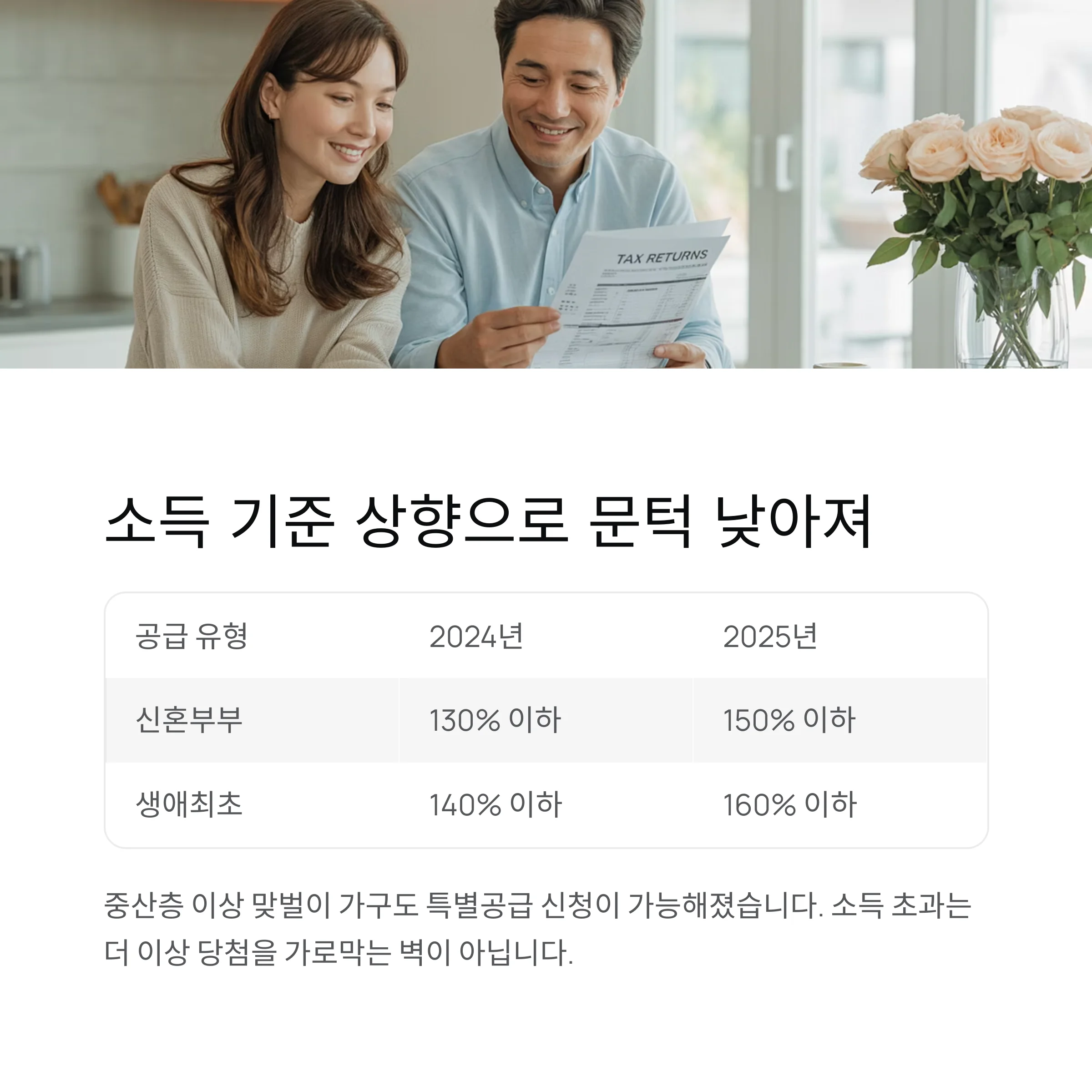 2025년부터는 신혼부부, 생애최초 특별공급의 소득 기준 상향이 가장 눈에 띕니다.