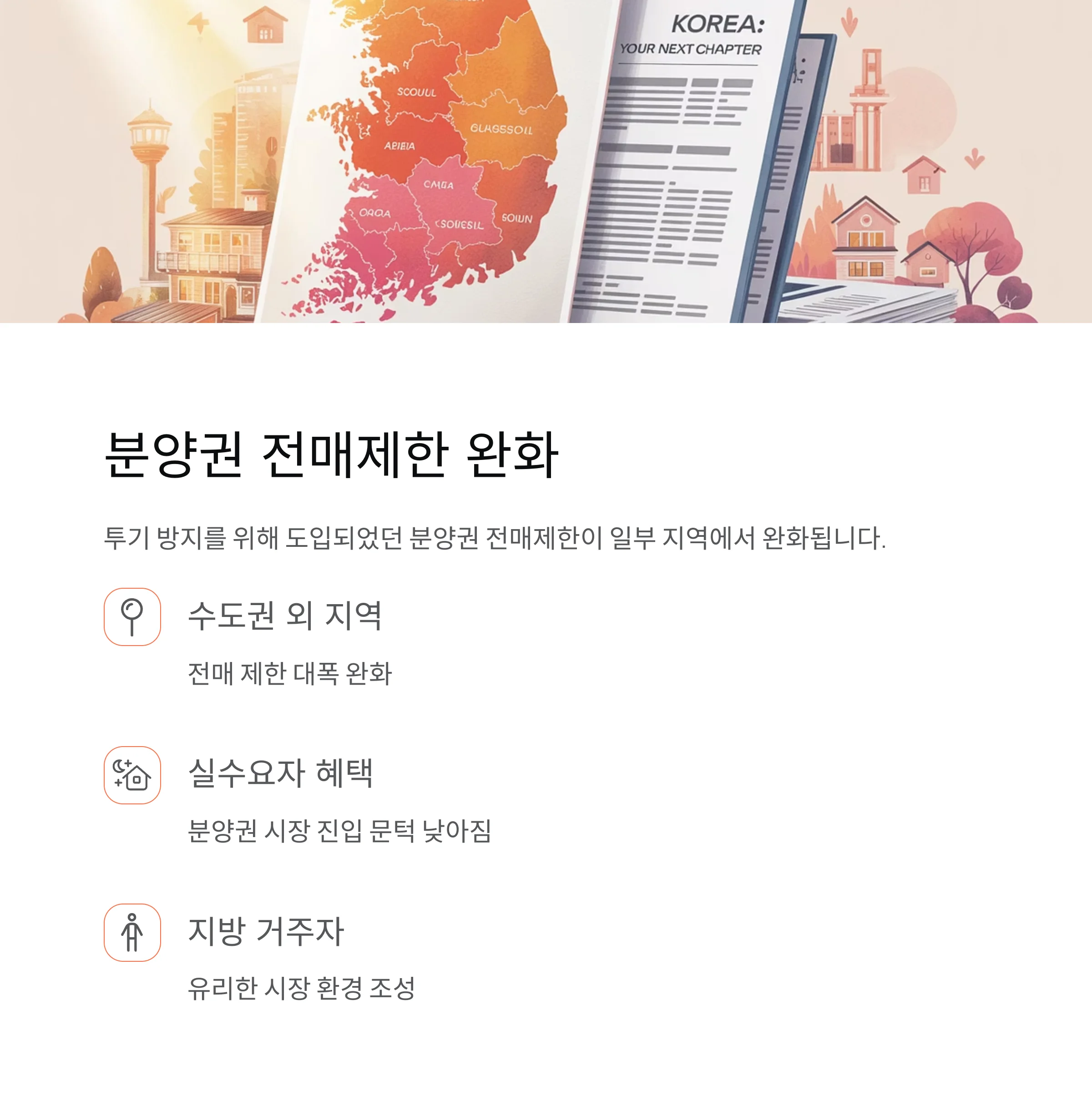 특히 수도권 외 지역은 전매 제한이 풀리면서, 실수요자들의 유입이 더욱 원활해질 것으로 보입니다.