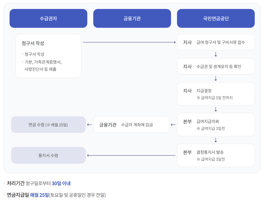 - 처리 기간은 평균 7~10일이며, 최초 수급은 사망월의 익월부터 시작됩니다.